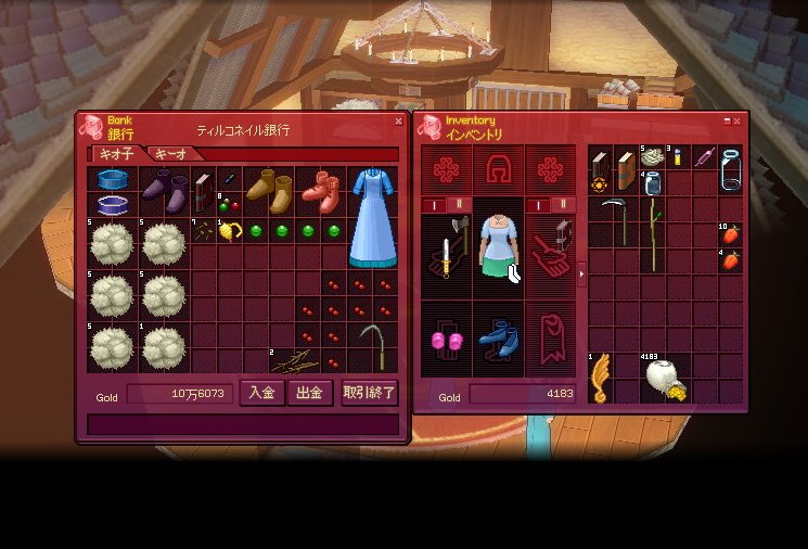 お金さえ払えば,ティルコネイルではマルコムの経営する雑貨店で衣類を購入できる。だが服などの装備品の彩色は,どの色が店に出るかは完全にランダムで,ゲーム内の日付が変わるたびに品が入れ替わるので,欲しい色の装備品が売り出されるまで店にずっと張り付く"色待ち"のプレイヤーもあとを絶たない。