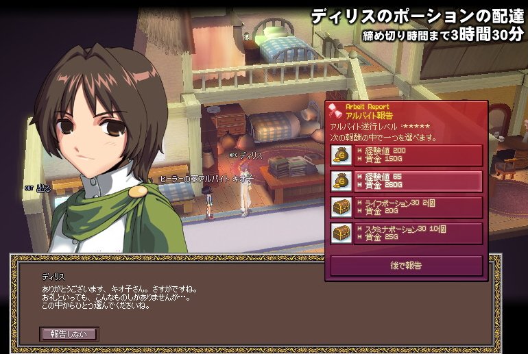 アルバイトは同じ時間に掛け持ちで複数は受けられないが,一つのバイトを終わらせてから次のバイトを受けるのは可能だ。ただし注意しなければならないのは,アルバイト完了をNPCが認定してくれる時間も決まっている点。アルバイトの達成条件を素早く満たしても,報告時間が来るまでは完了させられないのである。