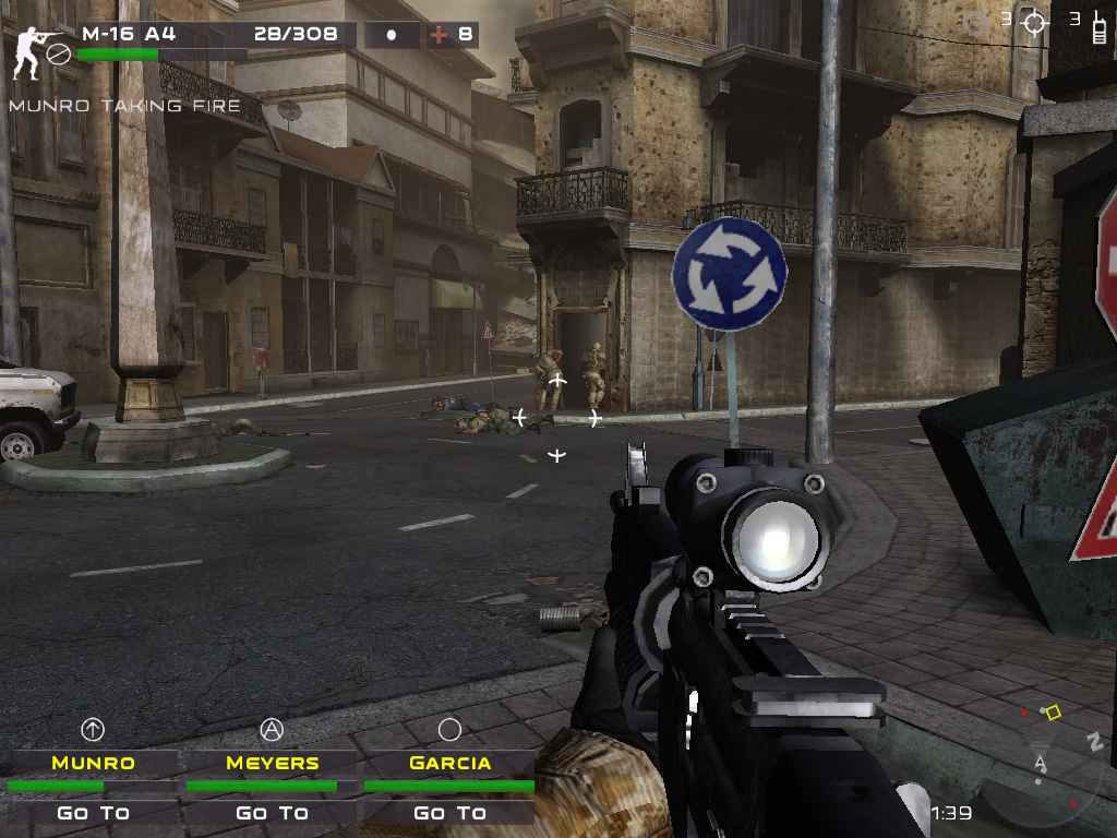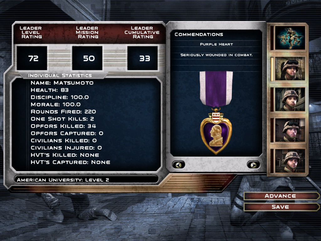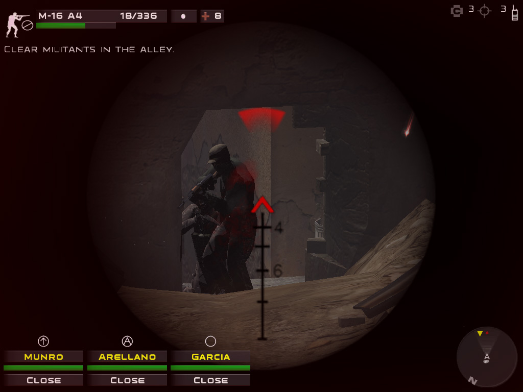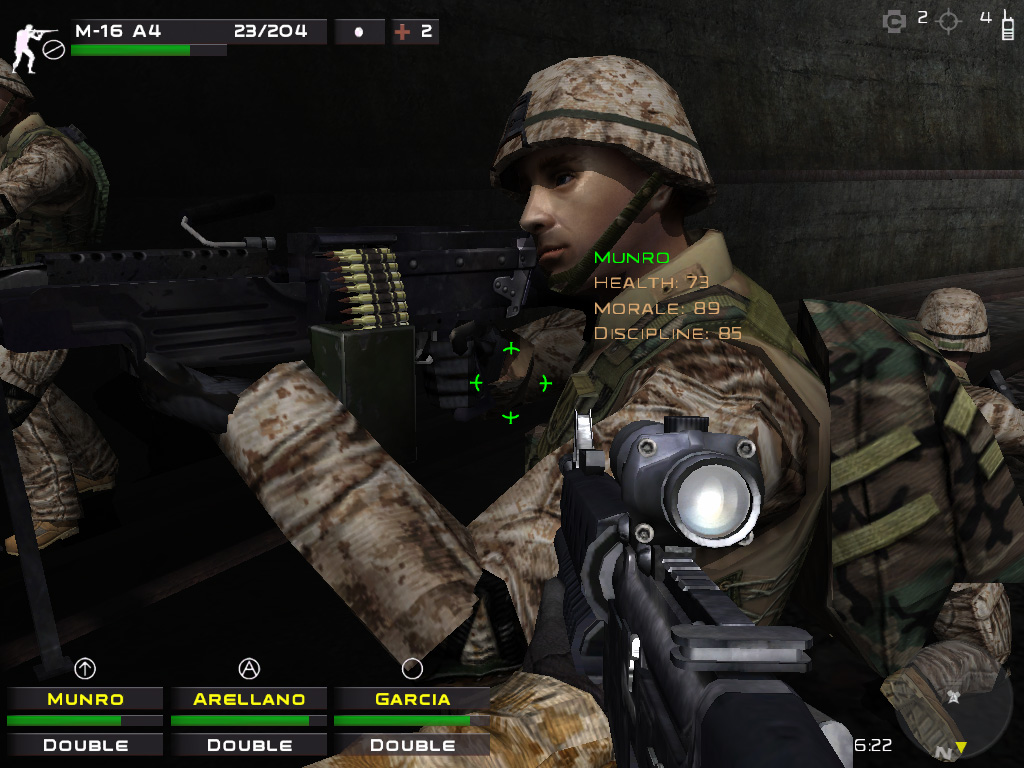 そんなことはどうでもいいが,プレイヤーは4人一組で編成される海兵隊の火力班(ファイアチーム)を率い,レバノン民兵,過激派,シリア兵,イラク兵などと戦い,数々のミッションをクリアしていくわけだ。訓練目的で開発されただけあって,部下に対する命令は分隊単位だけでなく各個人へも下せ,その種類も多い。また,兵士には「ヘルス」のほかに「士気」と「規律」のパラメータがあり,敵の攻撃を受けたり仲間が戦死したりすると,それらの数値が低下して,反応が鈍くなったり命令にすぐに従わなくなったりする。