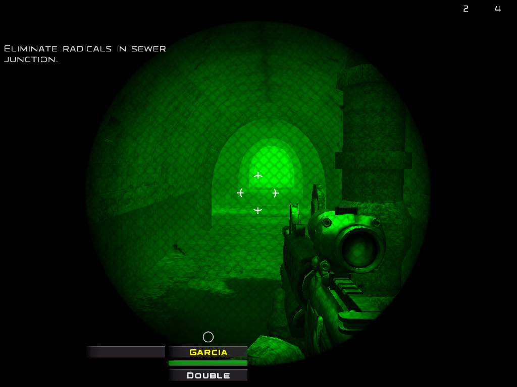 | 夜間任務やトンネルの中など暗いロケーションも多いので,ナイトビジョンは重宝する。視野は極端に狭い |
