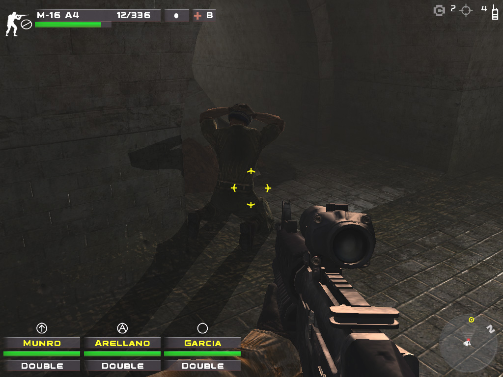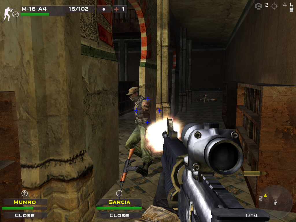 | 所持しているのはM-16A4突撃銃。グレネードランチャーおよびスコープ付ののハイテク銃だ。敵のAKも拾って使える |