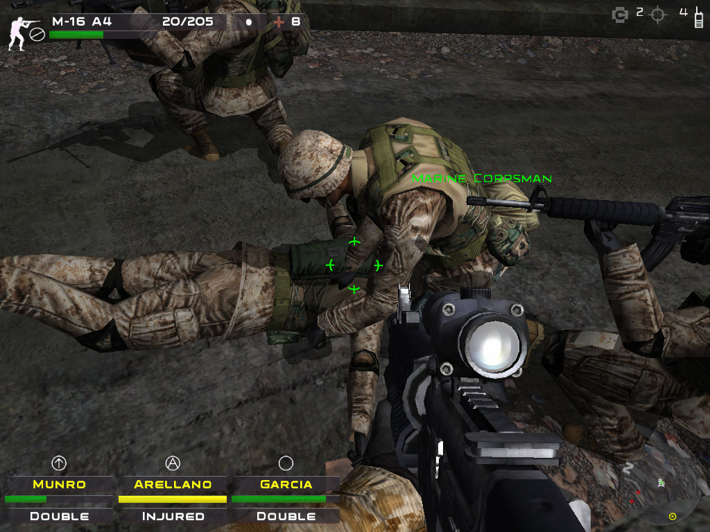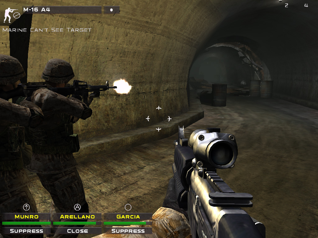 | プレイヤーを含めて各兵士には役割があり,十分に把握しておかないと能率的な攻撃はできない。そのへんが実際の訓練の眼目になるのだろうが,もう海兵隊員にはなれない筆者(主に年齢的な理由)にすれば,ちょっと面倒。とはいえ,ただのFPSとしても十分遊べるので,マニュアルは絶対に読まないと誓ったあなたでも大丈夫である |