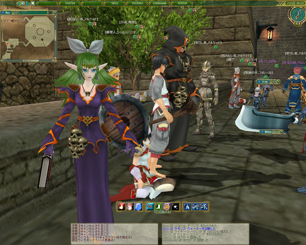 実はビスクで初めて見て知ったのだが,エルモニーという一番背の低い種族の走る姿がえらくカワイイ。両手を左右に広げて,ピューと一目散に走っていく様がなんとも愛らしいのだ。思わず作り直そうかとも思ったが,もう時間も遅いし(眠いし),とりあえずこのままで行くことに。セカンドキャラが作ることがあったら,試してみよう。