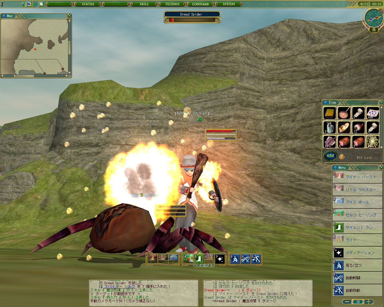 ところで,戦闘を教えてくれるフェイズでは,大きなイモ虫と戦うのだが,これにはまいった。なんといってもスキル制ということで,(当たり前だが)武器スキルを含むすべてのスキルがゼロなのだ。したがって,武器を振っても振っても全く当たらない。たまに当たってもダメージはゼロという始末。もちろん空振りしていても一応はスキルが上昇していくのだが,それにしても倒すまでに時間がかかりすぎる。ここで嫌になって,やめてしまった人って多いんじゃないだろうかと思いつつ,途中から自動戦闘モードに切り替えて本を読んでいました(笑)。いくらスキルがゼロだから当たらないとはいえ,これはちょっと段取り悪いだろうと思うのだが。