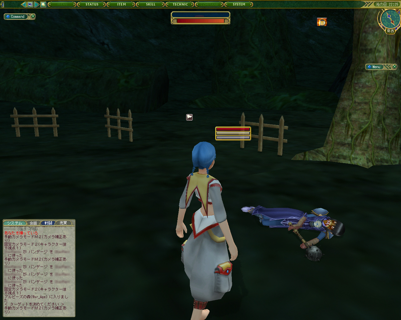 なんとかアルビーズの森には来られたのだが,このエリアには前回ひどい目にあった"オルヴァンプルート"が大量にいるではないか。ううむ,いろいろと前途多難だなぁと思いつつ,オルヴァンプルートに注意しながら進んでいると,倒れているプレイヤーを発見した。そういえば,ここはPvPエリアだっけか……と改めて思い出したが,そのプレイヤーの先になにやら光っているようだ。