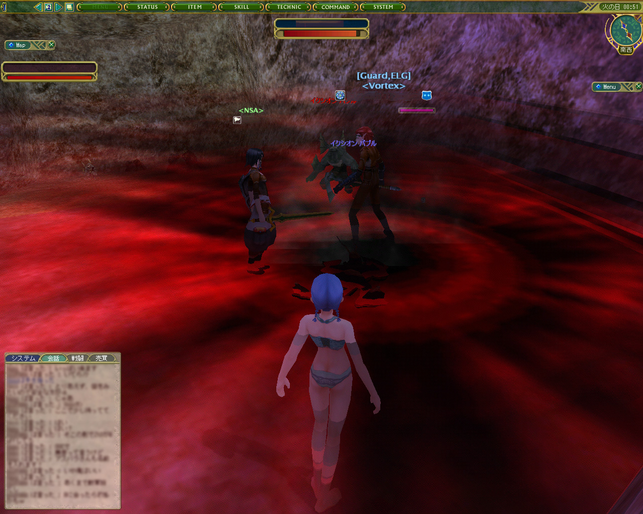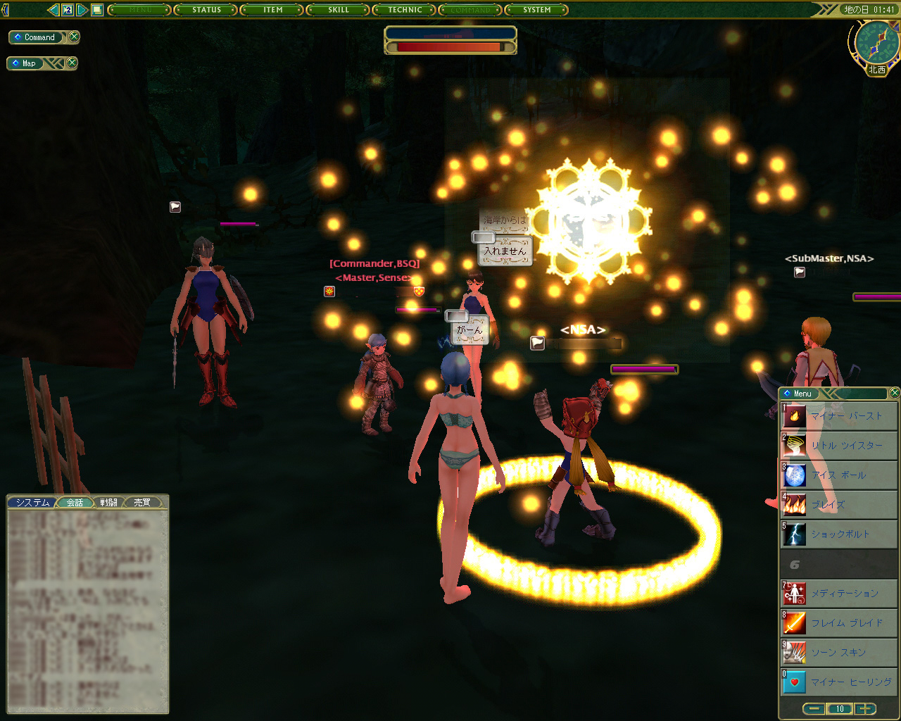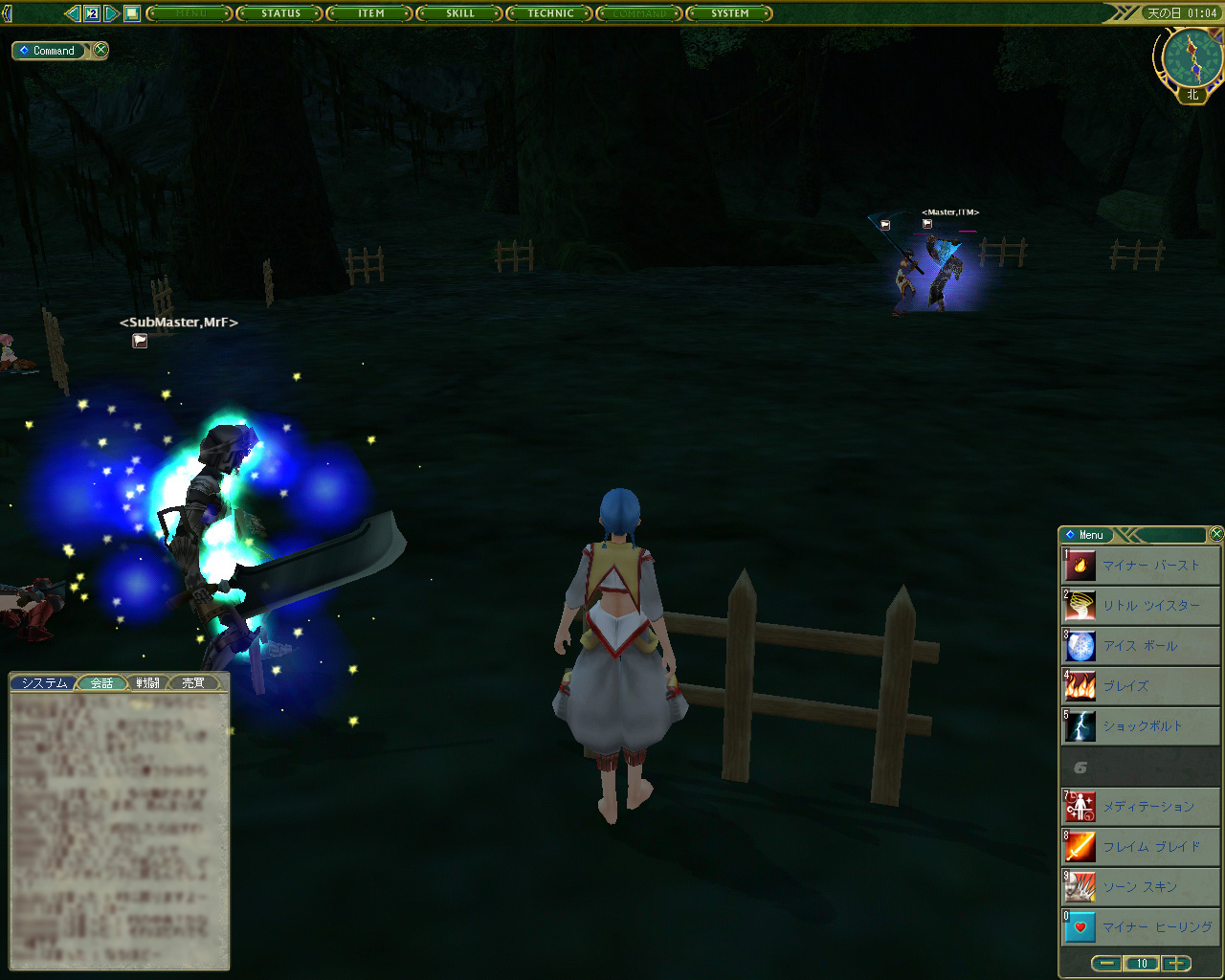 戦闘は,かなりスピーディ。お互いが近づいたり離れたりしながら斬り合い,魔法を詠唱したりしているが,魔法使い系の人も攻撃魔法よりは武器メインで戦っているようだ。PvPだと,魔法を唱えている暇などないのかもしれない。うーむ,魔法一筋というキャラクター育成は,まずったかなあ。