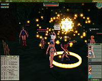 近づいてみると,円形に囲まれた柵の中でプレイヤー同士が戦っていた。柵の周囲には,数名のプレイヤーが座り込んでおり,戦いをじっと見ているだけのようだ。つまり,ばったり出会った敵軍とのシビアな戦いというのではなく,仲間同士での練習といったところなのだろう。問答無用で襲われることもなさそうなので,しばし見学だ。