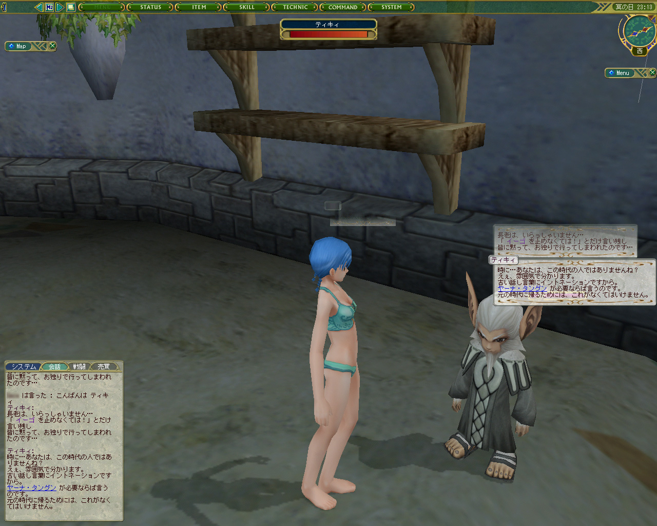 さて,気を取り直して,ビスクへとまた移動を開始する。ミーリム海岸からなら行けると思い,そこを目指したのだが,ここでも期待を裏切られてしまった。Present Ageでは,ミーリム海岸と城下町ビスクは,2本の通路で繋がっていたのだが,War Ageでは両方とも巨大な岩で塞がれていたのだ。エリアの繋がり方が微妙に違うので,Present Ageに戻るどころの話ではないといった感じ。とりあえず,ヌブールの村まで戻って探索をしていると,長老の家でティキィというNPCからノアピースをもらうことができた。これがあれば元の時代(Present Age)に戻れるらしい。というか,いままでビスクに行こうとした苦労はなんだったんだろう……と思いつつ,戻れる方法が判明して胸をなでおろす。もう少しWar Ageを探索すると決意したところで,以下次回。