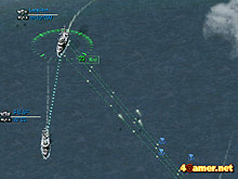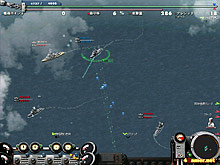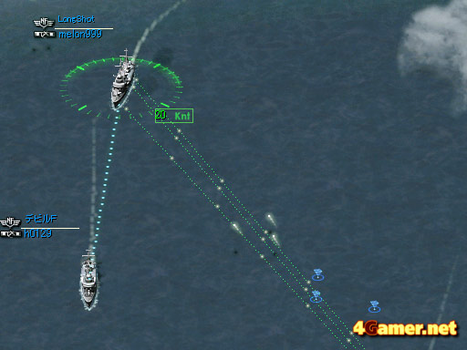 味方の位置を把握して動く 味方同士で密集して前進を続けていると,画面右下のレーダーに敵艦の反応が現れる。さあ砲撃戦のスタートだ。戦いの最中に注意したいのは,とにかく味方から離れてはいけないということ。とくに慣れないうちは敵艦に弾を当てることに夢中になってしまい,気がつくと自分だけが孤立して敵に囲まれているということが多々ある。最前線で孤立すると,敵の集中砲火の的になり,あっという間に沈められてしまう。とりあえずの操作を把握したあとは,砲撃に対して集中力を使うのと同じくらいの比重で,位置取りにも力を注いだほうがベター。まずは味方についていくこと,そして味方が狙っている艦を自分も狙うことを心がけよう。この連携の重要さが分かると,NAVYFIELDのプレイは一段と面白くなってくる。
