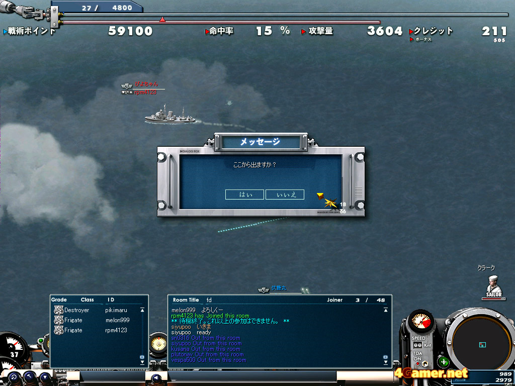 戦闘を最後まで見届けることの利点 あえなく敵に撃沈させられてしまった場合,バトルルームから退出するかどうかの確認メッセージが出る。素早く修理を済ませ,次の戦いに臨むのもよいが,このまま観戦を続けるのも面白い。自分が戦っているときにはそれだけで精一杯になってしまい,周りの状況を把握できないことも多いものだ。戦いを観察することに集中すれば,上級者のプレイから操艦や位置取りの技術を学ぶことができるだろう。