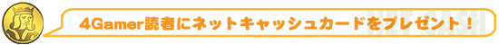 プレゼント内容は,通常のネットキャッシュカード(1000円分)とゲーム会社固有のスペシャルカード(非売品)の2枚セットだ。スペシャルカードの場合は,使用できるサイトが限定されるので注意。通常版のカードはネットキャッシュの加盟店すべてで共通に使用できる。また,スペシャルカードのゲームタイトルは指定できないので,どれが届くかは当たってからのお楽しみ! (プレミアものだけどヤフオクで売っちゃダメだぞ)。