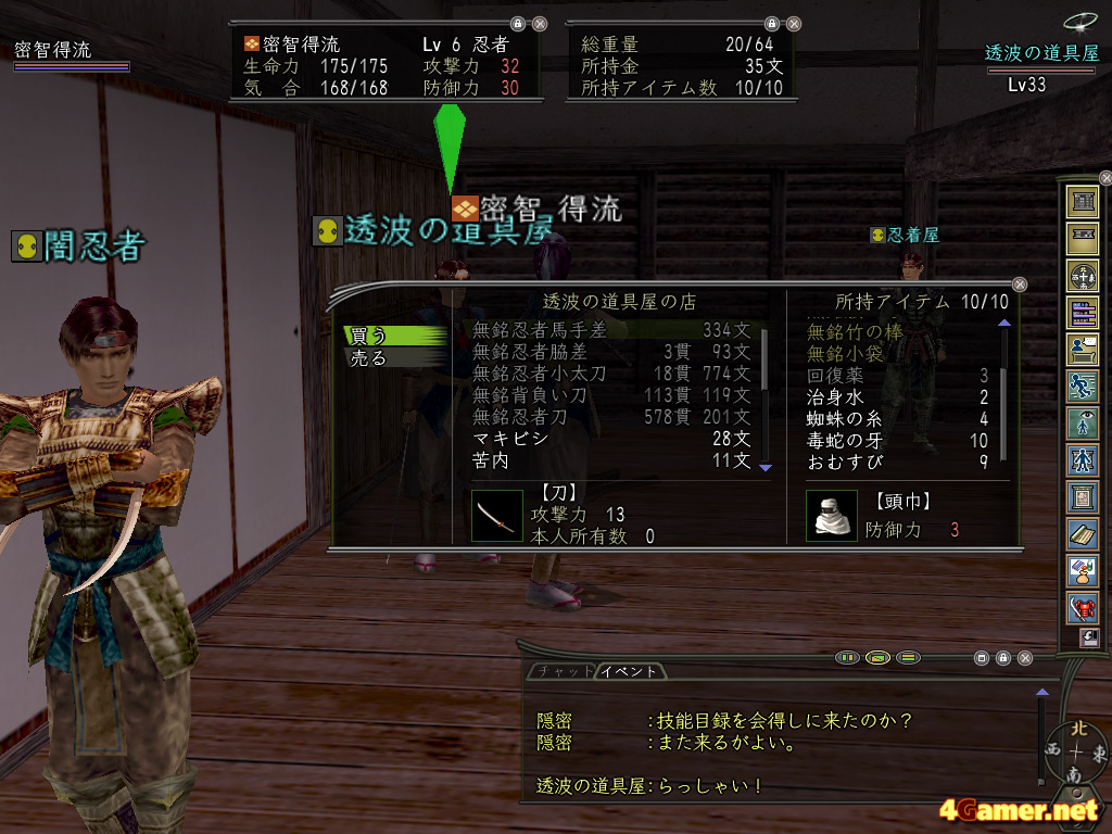 そして,少しお金が貯まるたびに装備を購入していく。ちなみに,各職業にあった初期装備は基本的に寄合所で買えるが,ものによっては"呉服屋"など違うところにいるNPCから買う必要があるみたいだ。