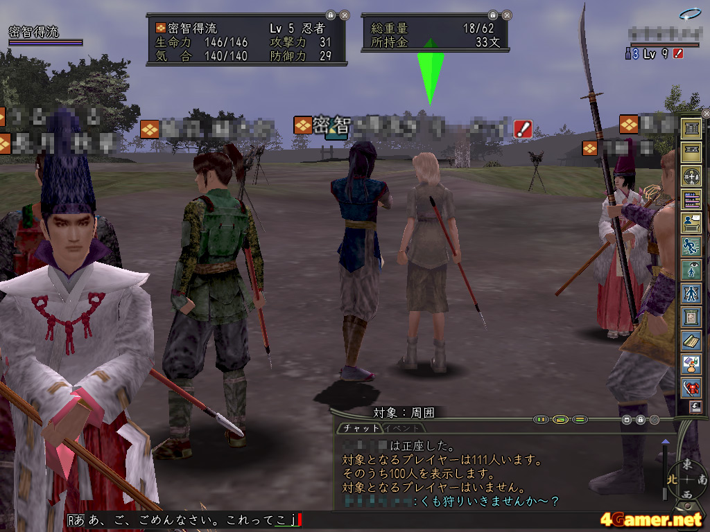 しかし,実際にはもっと簡単だった。人混みのなかでマゴマゴしていたら,「くも狩りに行きませんか〜?」と1対1の個人チャット("対話"という)で声をかけてもらえた。対話の使い方が分からず初心者丸出しで必死に応対。嬉しいことに徒党に入れてもらうことができた。
