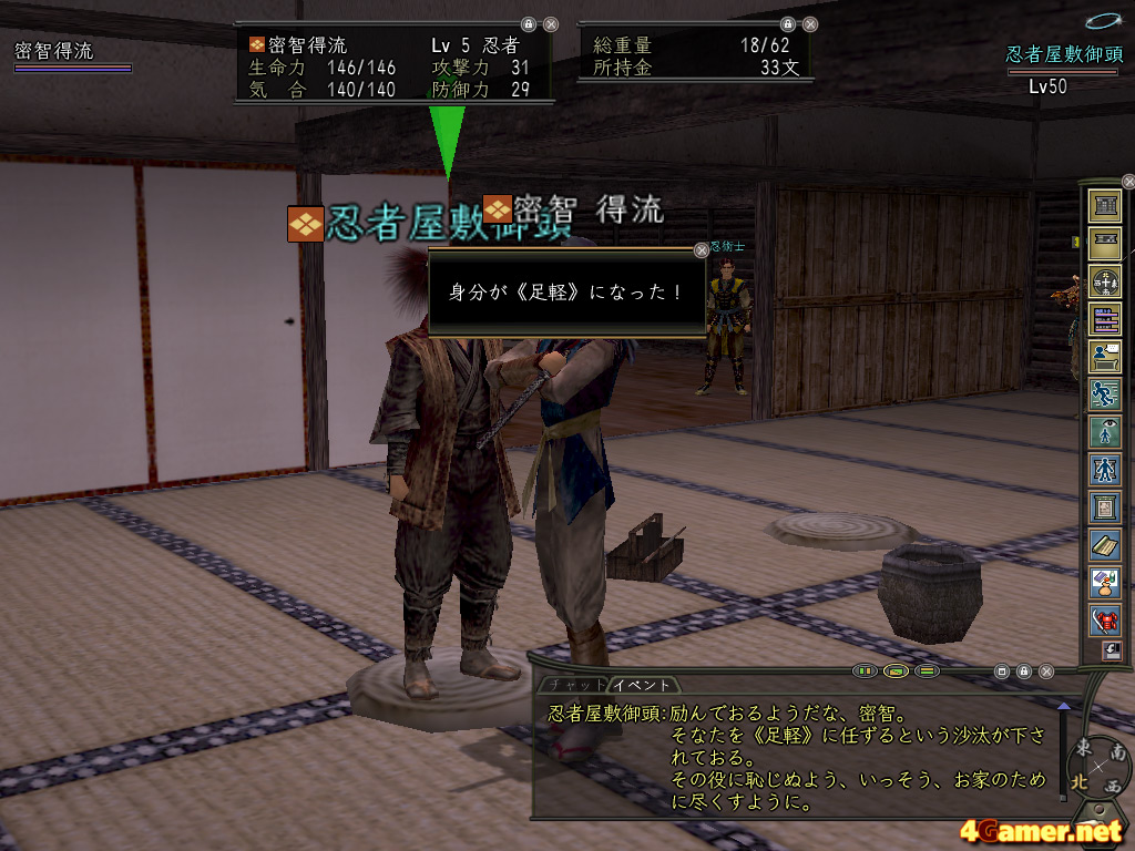 さて。いくつか任務に必要なアイテムが揃ったので,寄合所に戻ってお頭に話しかけると,ついに身分が"足軽"になった! どうやら一番初めの昇進である足軽への昇格は,勲功値ではなくレベルで決まるようだ。今日のプレイでレベル5に達したので昇進できたらしい。この調子で,どんどん高給取りを目指そう。