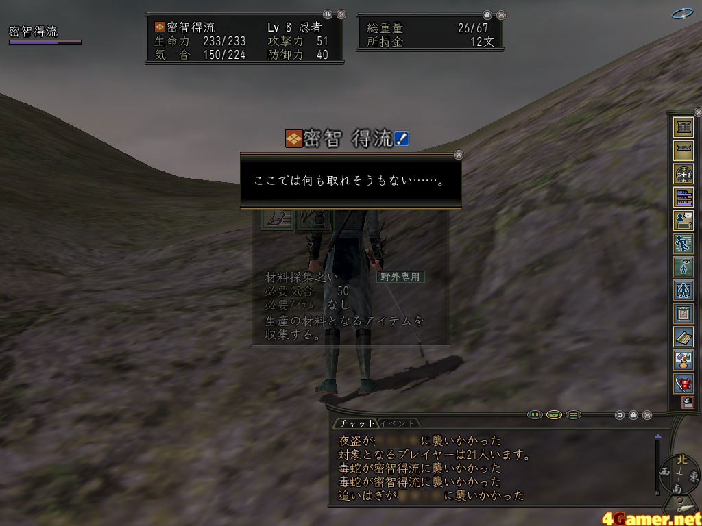 材料採集や"伐採"といった技能ごとに,それが使える場所がかなりピンポイントで決まっていて,その場所でないと生産材料は採れないのだ。甲斐の場合は,甲府の町のすぐそばの簡素な小屋のようなところが材料採集技能の使用可能ポイントだった。