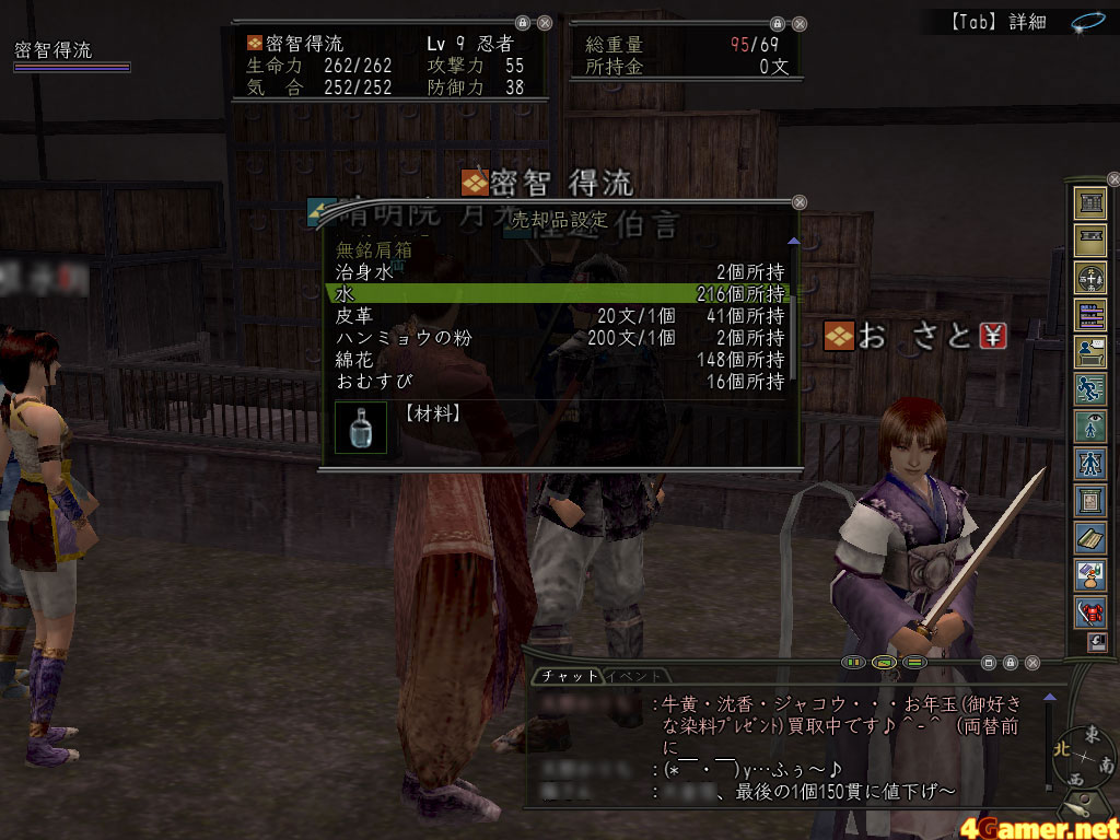 何度か材料を売っているうちに,ちょっとずつ生産の仕組みが分かってきた。信Onの各職業は,それぞれが独自の生産技術を持っている。修行さえすれば誰でもなんでも作れるようになるわけではなく,宝飾品ならば神職,毒なら忍者といったように,作成可能なものと職業は固定されているのだ。