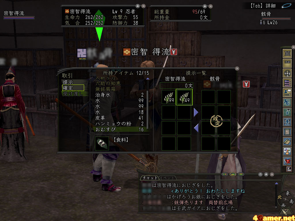 ある程度材料が集まった。これを売っておにぎりを買わないと,もうじき飢え死にする。いつも人がいっぱいいる"両替商"(銀行のこと)の前まで行き,とりあえずほかの人たちがどれくらいの値段で売っているのかを調査。信Onでは自分に"売却品有り"というフラグを立て,売りたいものの値段を設定すると,そのリストがほかのプレイヤーから見られるようになるのだ。