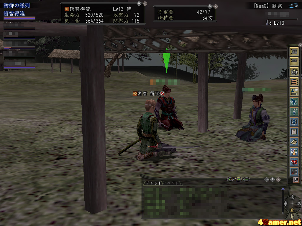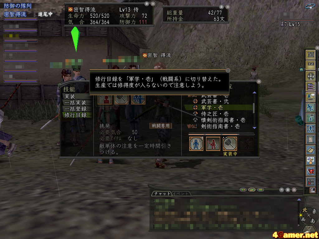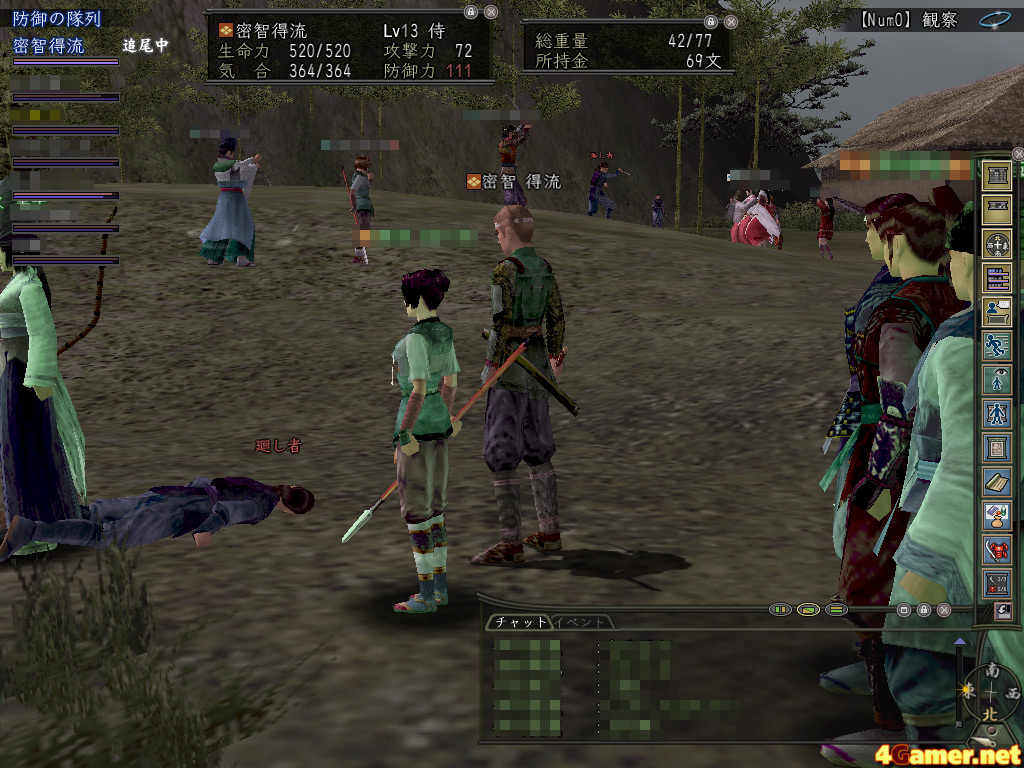 筆者の侍は二つある野外目録のうち一つめは皆伝し,二つめもすでに入手しているので,もう自分から山伏に会いにいく必要はない。しかし,このとき修理に出ていたもう一人の党員は,ちょうど二つめを欲しいと思っていたところらしい。発見した党員に「山伏のとこにいてー!!」と伝え,自身もそこに向かったようだ。無事に目録を得られれば何よりだと待っていたら,なにやら不穏なチャットが聞こえてきた。……どうも手に負えない敵に途中で襲われてしまったようだ。