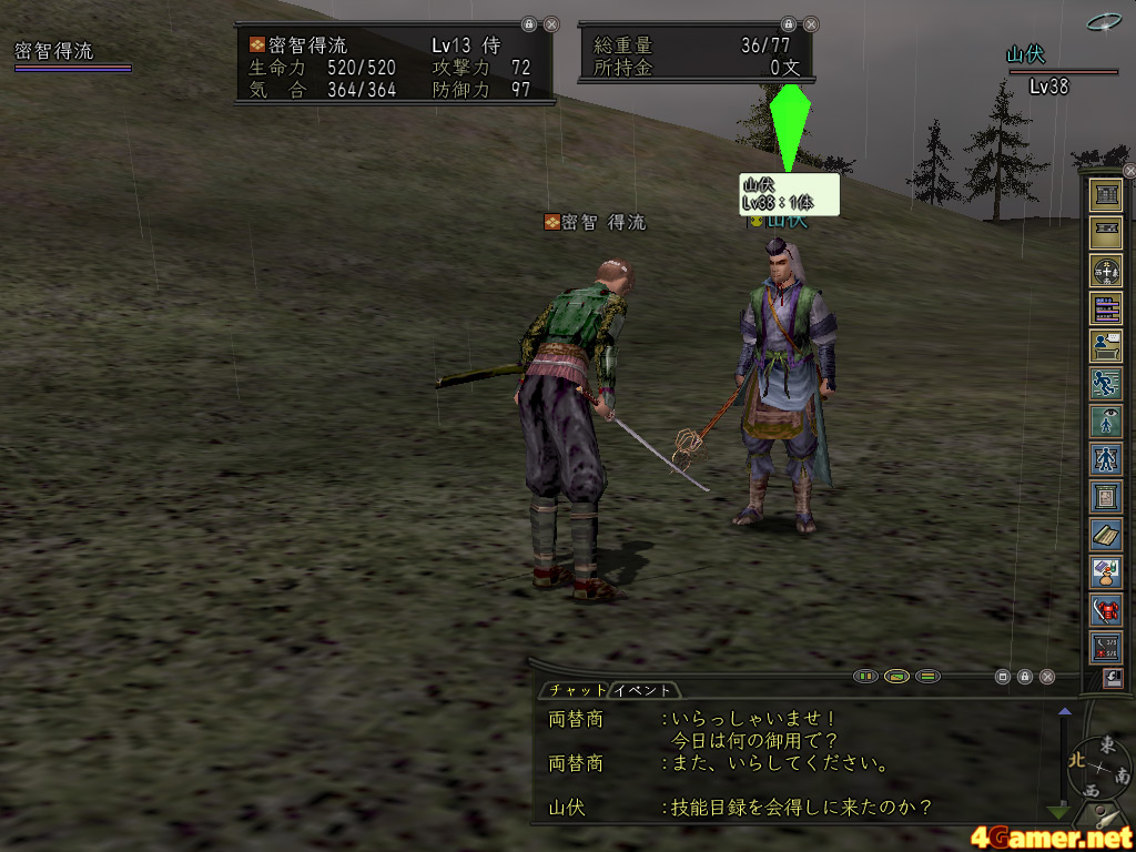 しかし! うっかり熊にかまれて死んだり,不良在庫を抱えて泣いたりとこのところパッとしなかった我が侍だが,このときは違った! どうも釣り野伏せが重要そうだということには少し前から気がついていたので,ちょっとずつ修業を進めていたのだ。あと数十分も戦えば覚えそうなところまできている。