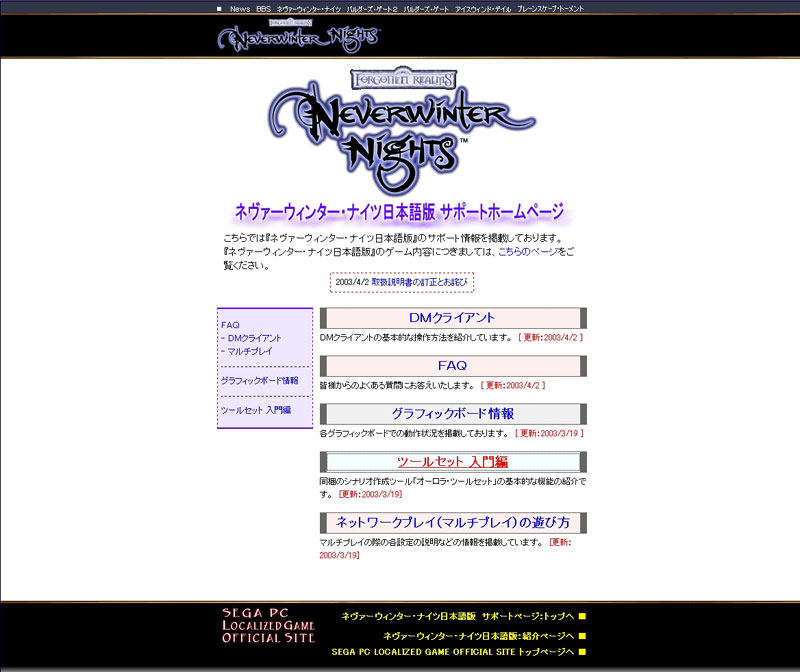 GAME OFFICIAL SITE内「ネバーウィンター・ナイツ日本語版」ページからジャンプできる,公式サポートページ。現在(2003年4月4日時点),「DMクライアント」「FAQ」「グラフィックボード情報」「ツールセット入門編」「ネットワークプレイ(マルチプレイ)の遊び方」といったコンテンツが設置されており,随時更新されている。