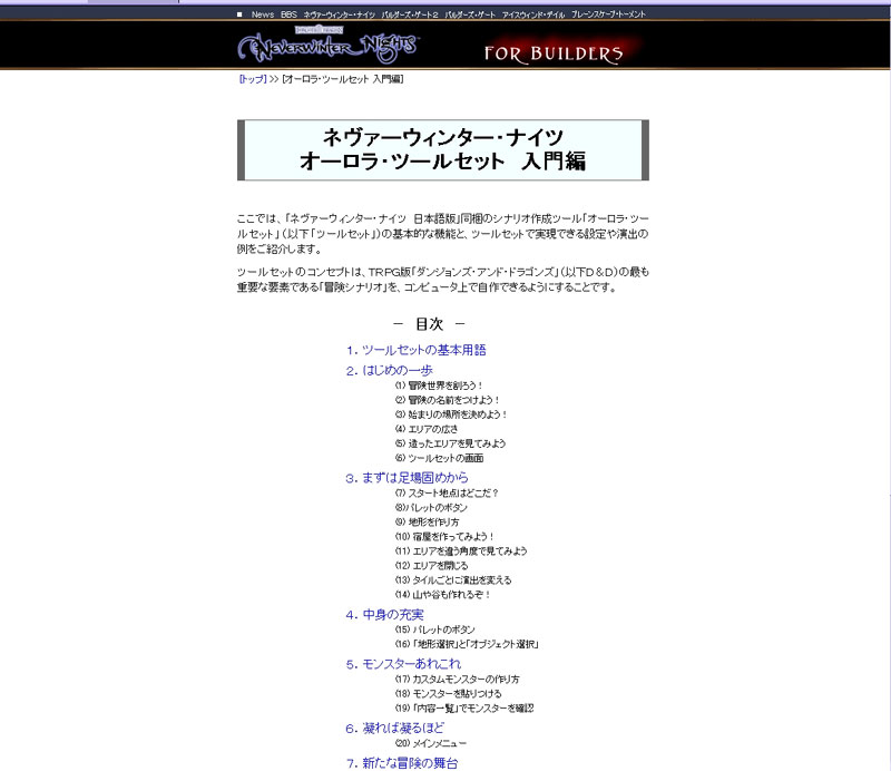 なかでもとくに注目したいのは,なんといっても「ツールセット入門編」。オーロラ・ツールセットの基本用語から,NPCとの会話をコントロールする「カンバセーション・エディタ」の使い方まで,オリジナルモジュールを作るために最低限必要な情報が丁寧に解説されている。マニュアルではやや不十分だった「オーロラ・ツールセット」の解説だが,このコンテンツを一読すればスムースにモジュール作成に取りかかることが可能だ。まだチェックしていないユーザーは,ぜひ"お気に入り"に登録しておこう。
