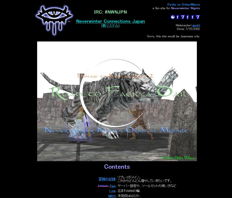 geshi氏が運営するNWNファンサイト。マルチプレイの楽しさがヒシヒシと伝わってくるリプレイ集「冒険の記録」は,マルチ時のロールプレイやモジュール作りの参考にもなる魅力的な読み物。ほかにサーバ設定やツールセットに関するTipsや,NWN初心者が見たらビックリすること請け合いの「扉絵コレクション」,オリジナルモジュールを紹介するコンテンツなどが用意されている。