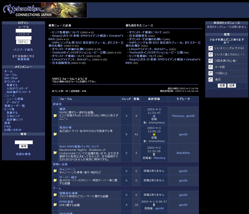 Masacy氏が運営するサイト。登録することで,フォーラムやダウンロードサービスが利用可能となる。会員登録はもちろん無料。会員数は4月4日現在で140名を超えるほどの盛況ぶりだ。NWNを思いっきり遊び倒したいなら,NWCJへの会員登録は必須といってもいいだろう。