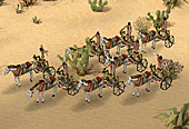 「パルティア騎兵隊」も,うまく使えば非常に強いユニットだ。強いというより,うまく使えれば"格好いい"という表現が適切かもしれない。敵の突撃をさらりとかわしながら,流鏑馬のごとく敵に矢を浴びせかける姿は,いかにも"精鋭"といったおもむきである。 上位白兵戦ユニットである「戦車」は,ローマの「近衛兵」やガリアの「狂戦士」と同タイプのユニット。騎兵系ユニットではあるが,乱戦に強く並み居る敵をバッタバッタとなぎ倒してくれる。高いヒットポイントを有するばかりか,「ゲルマン騎兵」の突き刺しも効かないなど,どんな状況でも安心して投入できる点は大きな強みといえるだろう。
