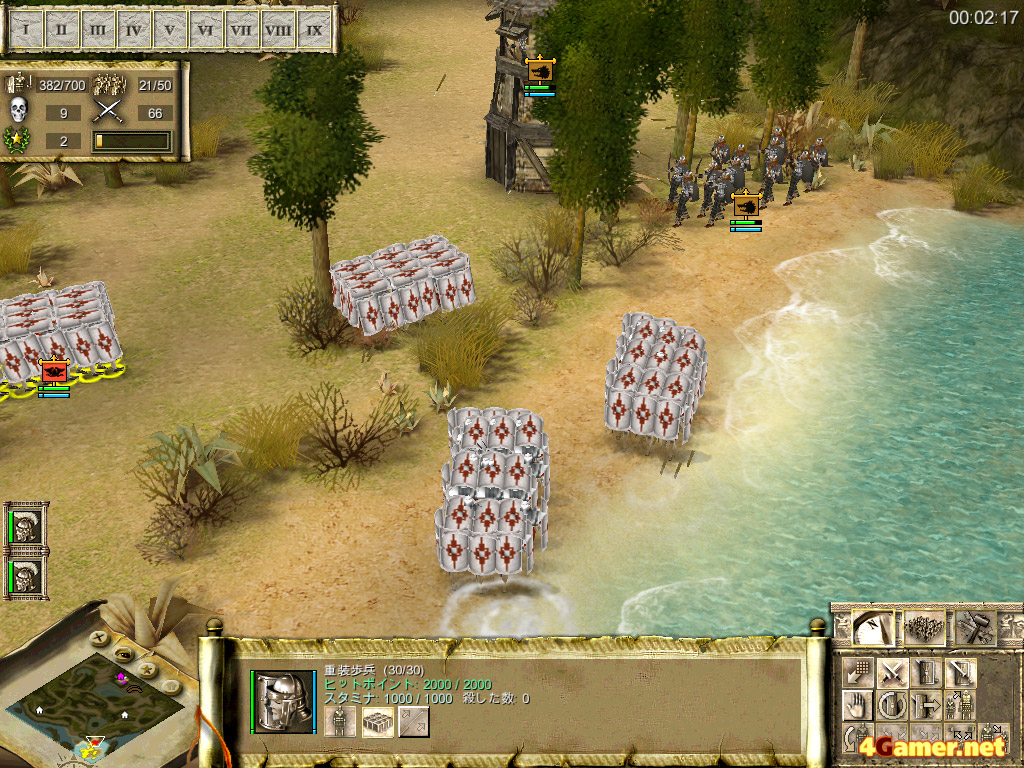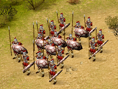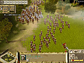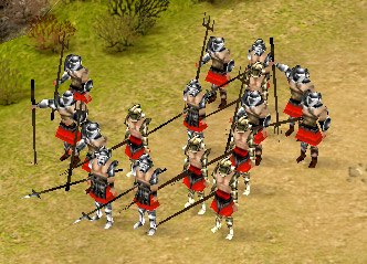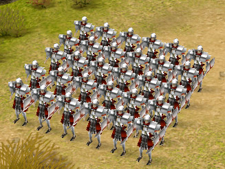 ゲームであるプレトリアンでも,そのような歴史的事実を踏まえてあるのか,ローマ軍の主力となるのは,攻守共にバランスの取れた「重装歩兵」である。ほかの歩兵系ユニットに比べて(上級ユニットは抜きにして)ワンランク高い白兵戦能力を持ち,また本来苦手であるはずの射撃系ユニットに対しても,「亀甲盾隊形」をとることでダメージを受けずに間合いを詰めていけるなど,重装歩兵の能力はとにかく万能の一言に尽きるのだ。ただ同系統のユニットである「槍兵」に比べて,1.5倍ほど召集に時間を必要する点は大きなデメリット。ゲーム開始直後のスタートダッシュや素早くゲームが展開していく局面などでは,若干使いにくさを感じる点はご愛敬といったところだ。まぁあまりに万能過ぎるとゲームとして成り立たなくなるだろうから,これは当然の処置といえよう。