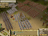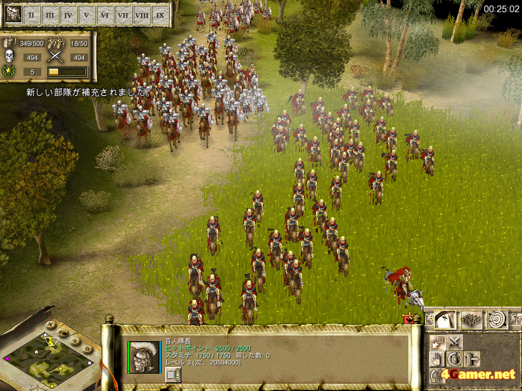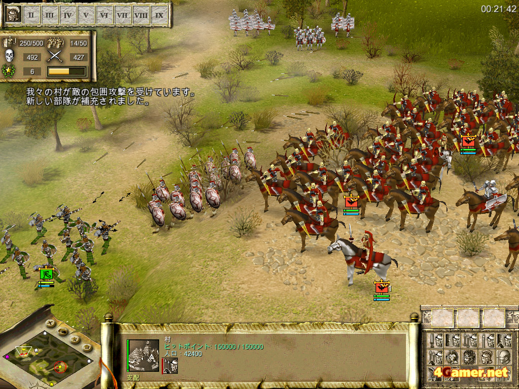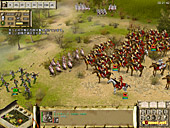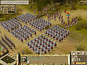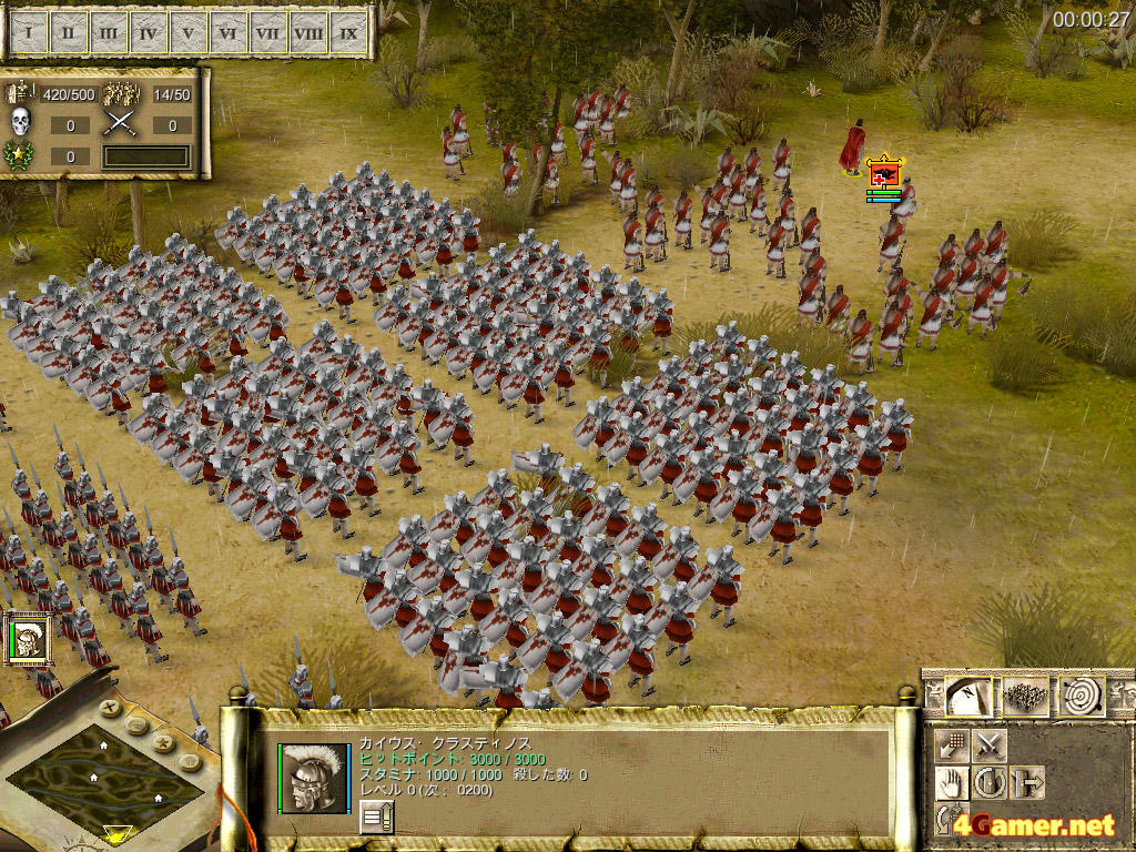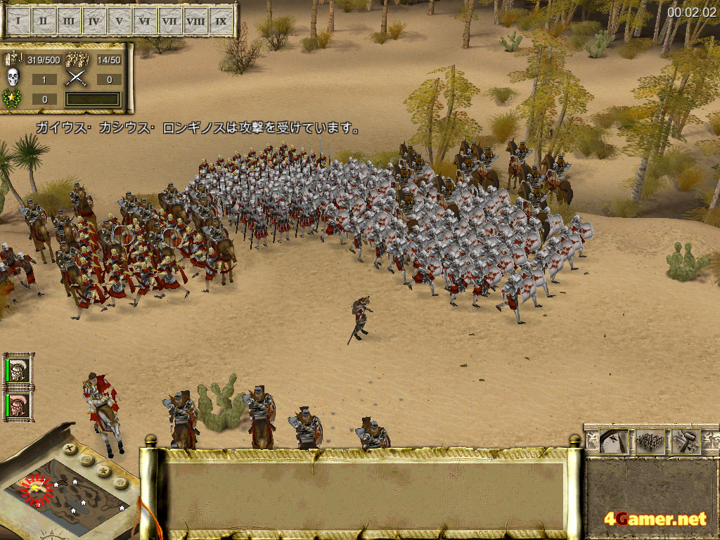 歩兵を真ん中に置き,機動力のある騎兵隊を両翼に配置するというのは,ローマに限らず最も基本的な陣形となるワケだが,ローマの重装歩兵は弓に対する防御力が高いため,間接攻撃によって陣形を崩されにくいという特徴がある。ガリアやエジプトといったほかの勢力と比べて,非常に堅固な陣形を敷くことができるのだ。