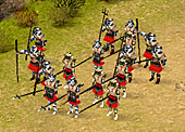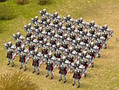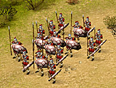 また騎兵系ユニットは,戦闘によって「名誉ポイント」を稼がないと召集できない上位ユニットだが,実戦闘力自体はそれほど高いものではない。歩兵系ユニットと白兵戦で勝負をすればあっさり負けてしまうし,なによりも部隊自体の人数が非常に少ないのだ(槍兵は30人だが,騎兵は12人)。よって騎兵は,主に歩兵系ユニットの脅威となる弓兵やバリスタ/投石機など,各種間接攻撃ユニットの牽制に運用することになる。高い機動性を生かして,後方に配置されたそれらのユニットに一撃を加えるワケだ。大きな盾によって防御態勢を敷いた重装歩兵といえども,さすがに投石機やバリスタから繰り出される巨大な石や矢は防げないので,歩兵が前進するときに無駄な被害を出さないためにも,多少の遊撃隊(騎兵)は欠かせない存在といえる。