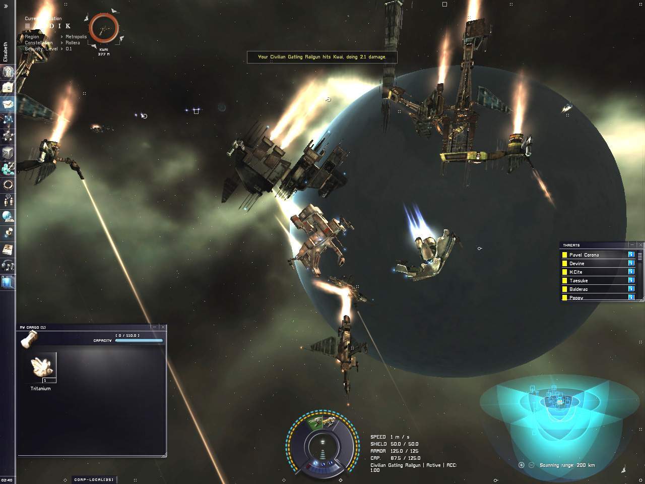 「Eve Online」は,5月中のリリースが予定されており,現在は3万人から4万人規模のβテストが進行中である。すでに"コーポレーション"と呼ばれるギルドが500近く設立されており,自分たちのアイデアを盗んだとコーポレーション同士での訴訟問題が発展するなど,仮想世界の外でも激しいバトルが行われている。