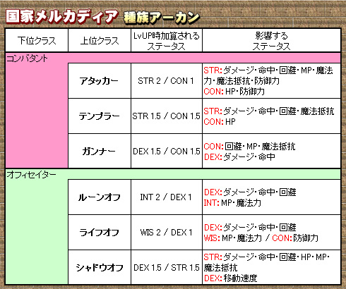 これに対してアーカンでは,コンバタントをベースとするアタッカー,テンプラー,ガンナー。オフィセイターをベースとするルーンオフ,ライフオフ,シャドーオフの,計6種類のクラスがある。両種族のクラス特性を表にまとめてみたので,これからゲームを始める人は,そちらを参照しつつ種族/クラスを決めるといいだろう。