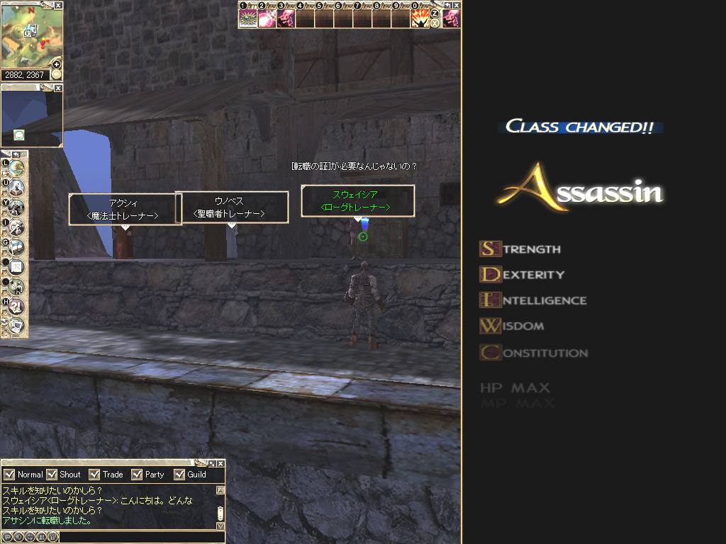 レベル10になったら,クエストの流れに従っていれば転職が行えるはずだ。種族や下位クラスによって対応NPCが違うので,間違えないように話しかけ,"転職"で上位クラスを選択しよう