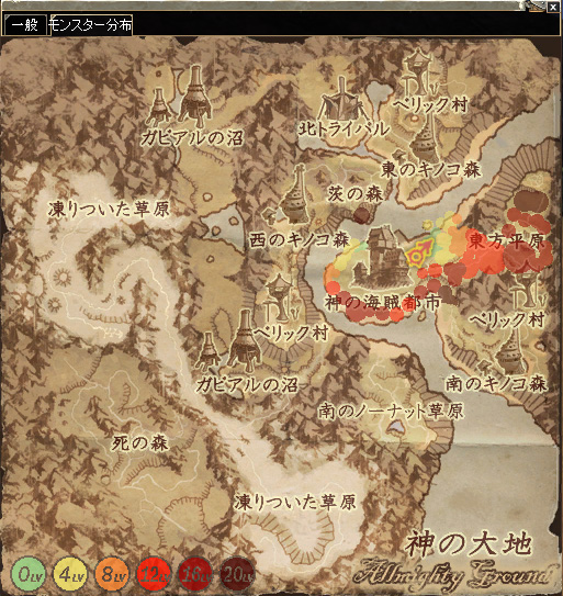 Lキーを押せばマップが開く。マップの"モンスター分布"というタブを押せば,自分のレベルから見た,レベル別モンスター分布が大体わかるようになっている。これはレベル3程度のモンスター分布なので,Mobの名前付きマップと見比べてもらうと活用しやすいだろう |