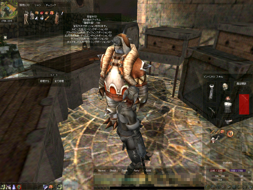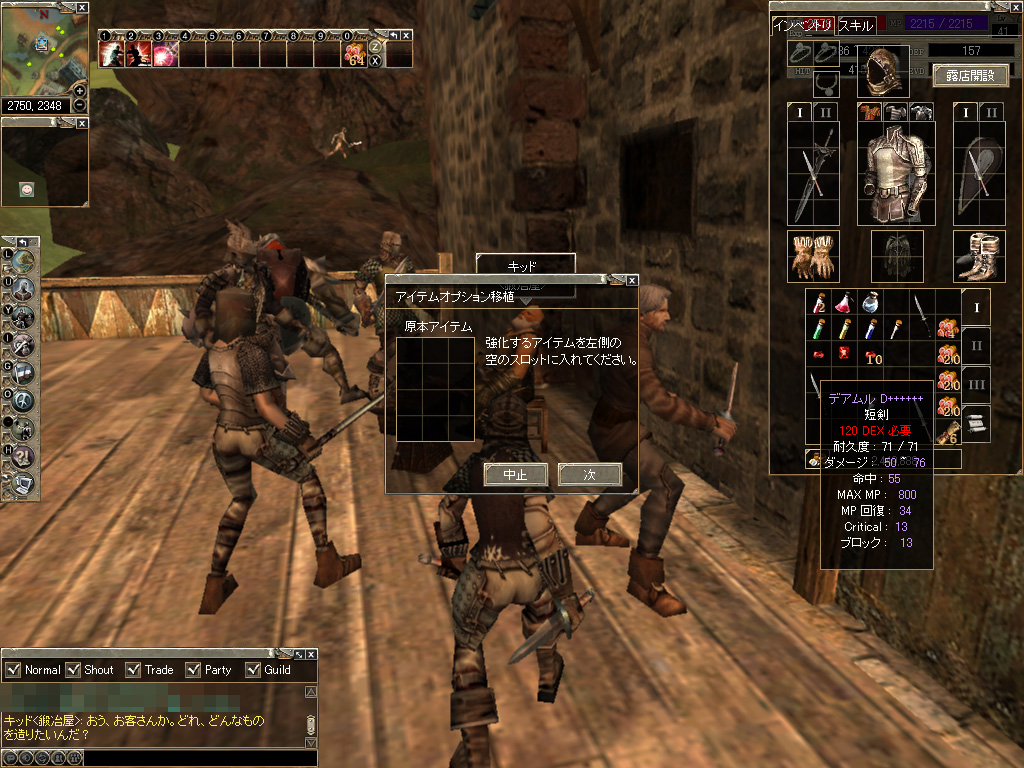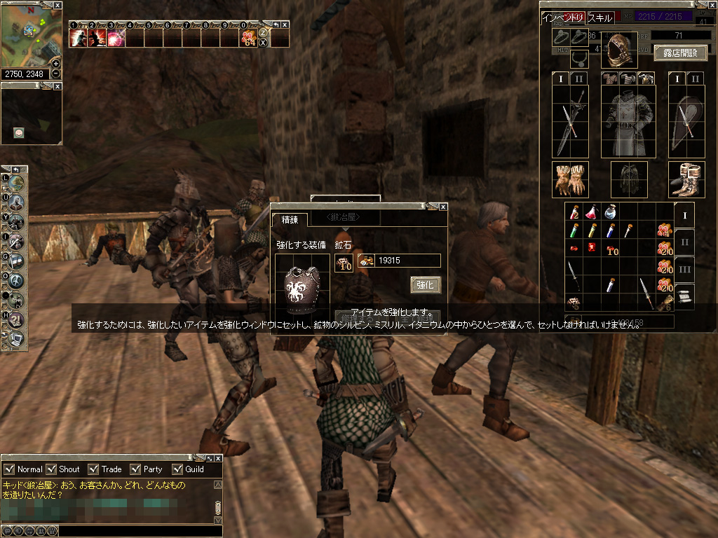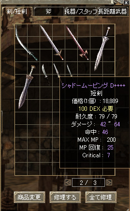 精錬に使用する材料だが,シルビンはそれなりに見かけるものの,ミスリルやイタニウムは希少なうえ,1回の精錬で鉱石を10個ずつ消費するのでなかなか頭が痛い。さらに精錬には成功失敗の判定があり,失敗した場合にも鉱石は消去される。シルビンなどは,それこそ低レベルのころから溜め込んでいき,ある程度レベルが上がって,レベルが上がり辛くなってきたころに,武器防具をアップグレードするのがよさそうだ。