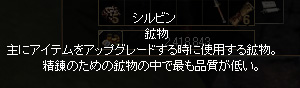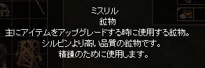 Bグレード以上の装備に関しては,より強いモンスターを倒すか,武器防具の精錬を成功させなければ入手できない。精錬するためには,モンスターを倒して得られる"シルビン" "ミスリル" "イタニウム"といった鉱石を使用する。これら3種の違いは,成功率。序盤から比較的容易に手に入るシルビンは最も成功率が低く,レベル30が見えてくるころから徐々に取れるようになるミスリルが,それよりやや成功率が高い。イタニウムはミスリルよりもレアだが,最も精錬成功率が高いということになっている。