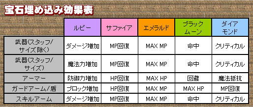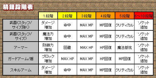 なお,精錬には段階があり,装備の種類によって段階ごとの強化項目が異なる。さらに5段階めまではそれぞれ5種類の項目が上がっていき,その後6段階めから10段階めまではソケットが追加されることになる。このソケットには宝石をはめられ,宝石によってさまざまな項目の強化が可能となる。(下記の宝石埋め込み効果表参照)