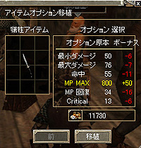 手順としては,同じグレードの同じ武器を用意し,ベースとなるアイテムをセットした後,犠牲となるアイテムをセットする。このとき,どの項目を移植するかを選択するのだが,項目によって増減のしかたが異なるので,表示されている結果を見て納得してから確定するのがいい。そこで決定ボタンを押すと,移植後のアイテムが完成,犠牲アイテムは消滅することになる。ただし,ヘルム,手袋,ブーツ,プロテクトアーム,ベルビスなどにはオプション移植が行えない。そのため,例えば付加効果つきのヘルムなどは,がんばってより良いランクの物をお店で選ぶしかないようだ。