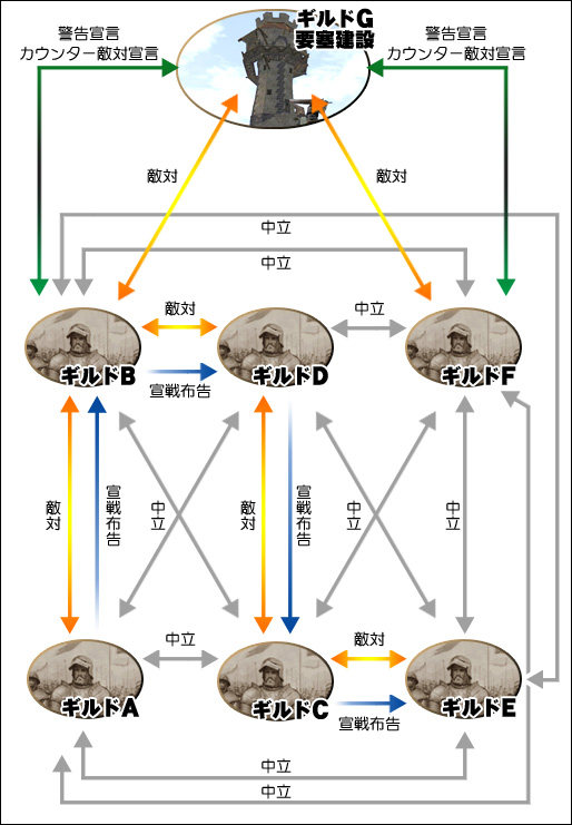 宣戦布告から敵対関係,中立関係に関する複雑な関係については,ギルド間の関係図を参照してもらいたい。