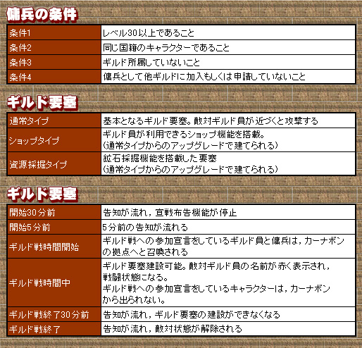 ギルド戦と同時に導入されるのが「傭兵システム」だ。これは"同国籍"で"ギルドに所属していない" "レベル30以上"のキャラクターが,ギルド戦に参加するために用いられるシステムだ。参戦したいギルドへ傭兵申請し,承諾されると傭兵としてギルド戦に参加できるようになる。ただし,レベル30というのはギルド作成が可能なレベルと同等という程度で,実際にはそれなりのレベルでなければ活躍は難しいだろう。またギルド側から,傭兵に入ってほしいと思っているキャラクターへ傭兵加入勧誘を出すこともできる。どちらからも傭兵としての登録要請が行えるので,ギルド員勧誘の代わりにも使えるシステムだ。
