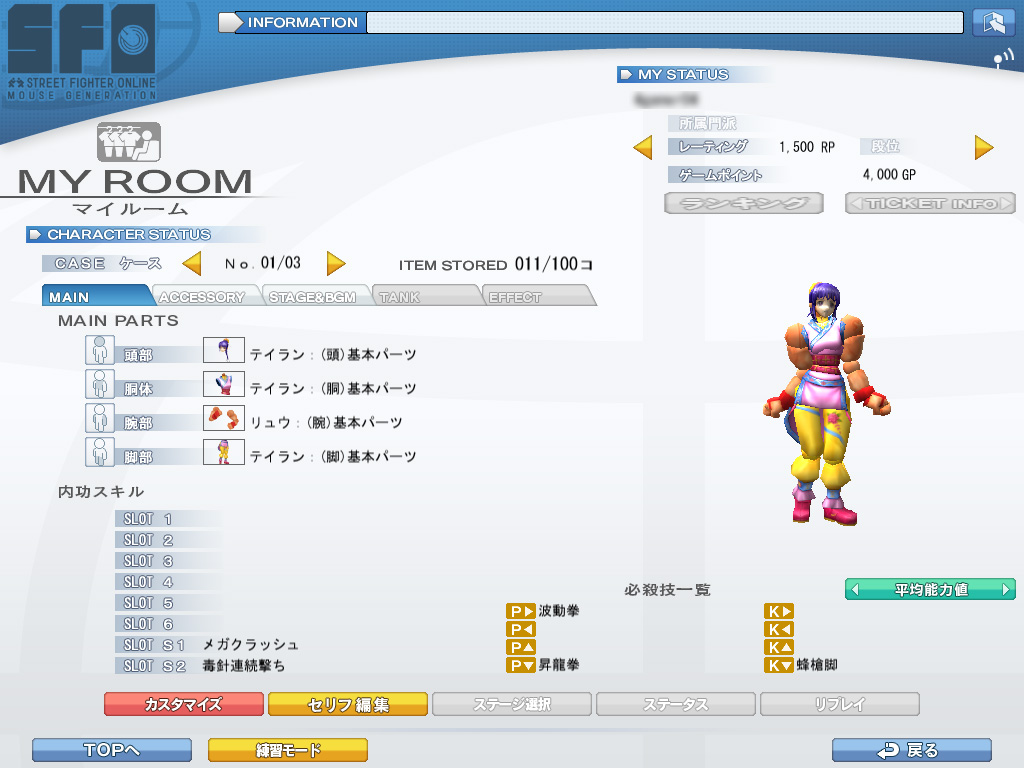 それでは本作のもう一つの目玉である,キャラクターのカスタマイズについて説明しよう。プレイヤーが操作するキャラクターは頭/腕/胴/脚の4パーツに分かれており,フィギュア感覚で自由に組み替え可能だ。パーツそれぞれには,使用可能な必殺技や内功スキルが設定されている。例えばリュウの腕には必殺技の波動拳と昇龍拳,春麗の脚には百裂脚とスピニングバードキックといった具合である。すなわちパーツの組み方によっては,リュウと春麗双方の必殺技を併せ持つ夢のキャラクターを作ることもできるというわけだ。