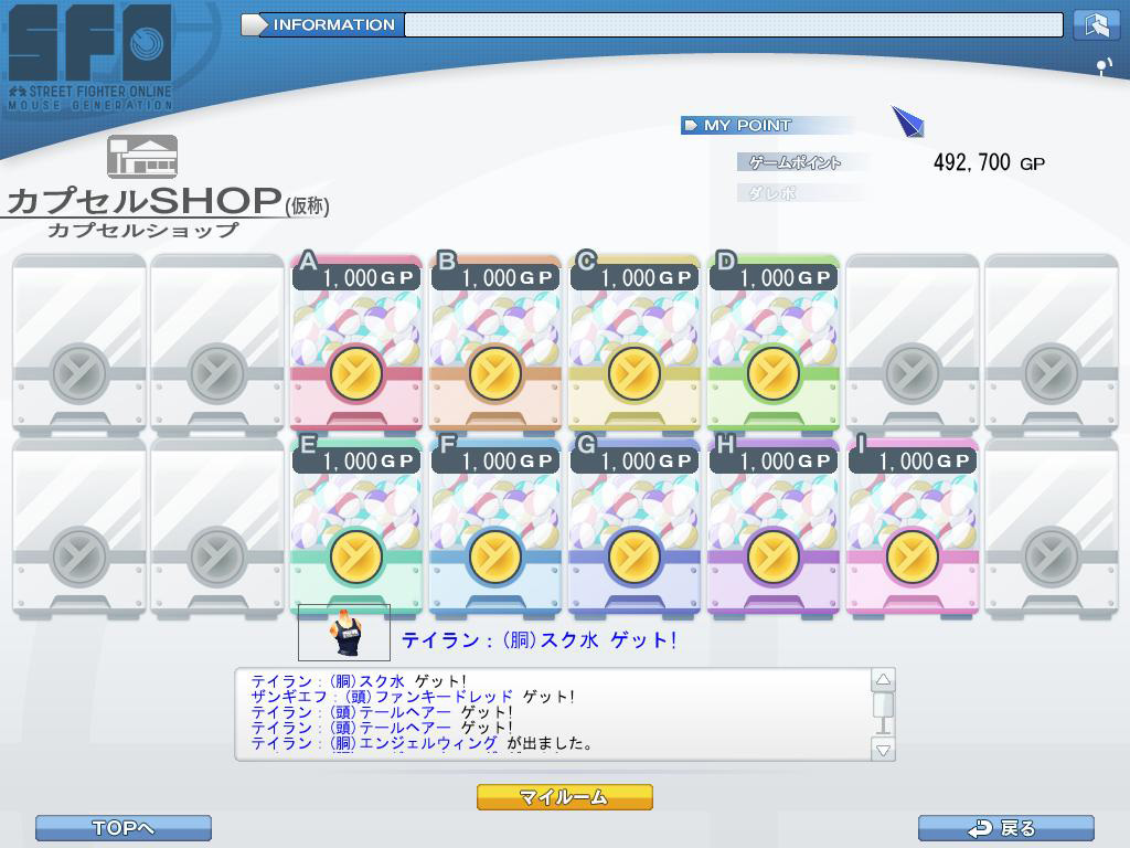 キャラクターの各パーツは,「カプセルマシン」からアバターアイテムとして入手できる。カプセルマシンは,対戦するごとに得られるポイントを消費してランダムにパーツと交換する,いわゆるガチャガチャのことだ。とはいえ完全にランダムというわけではなく,リュウならリュウ,春麗なら春麗とキャラクターごとにカテゴライズされているので,狙っているパーツを比較的出しやすいかもしれない。