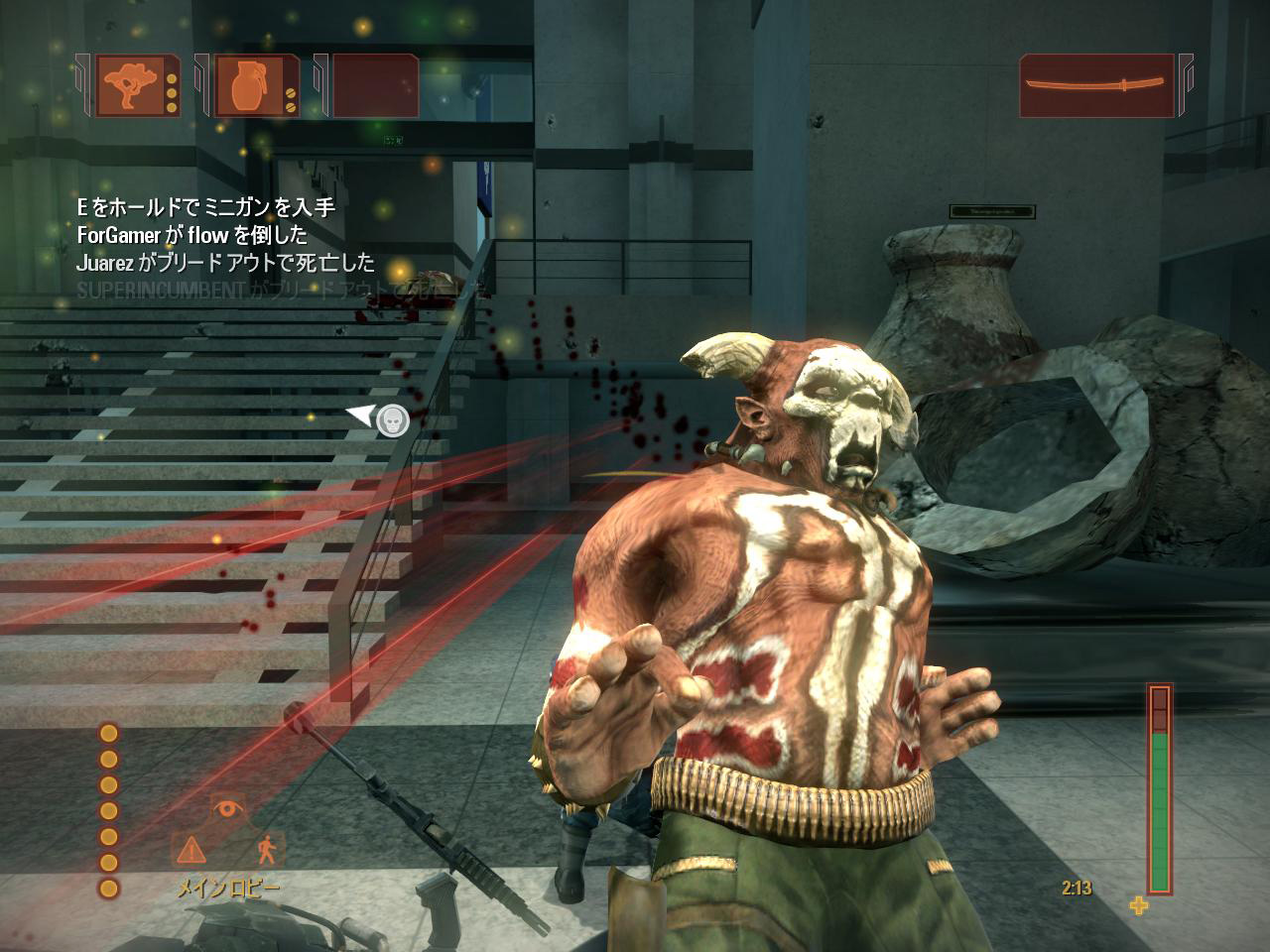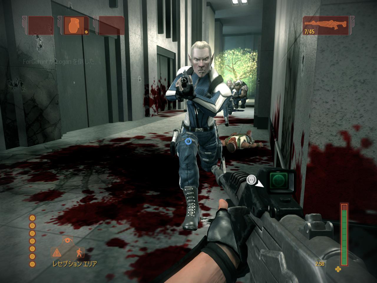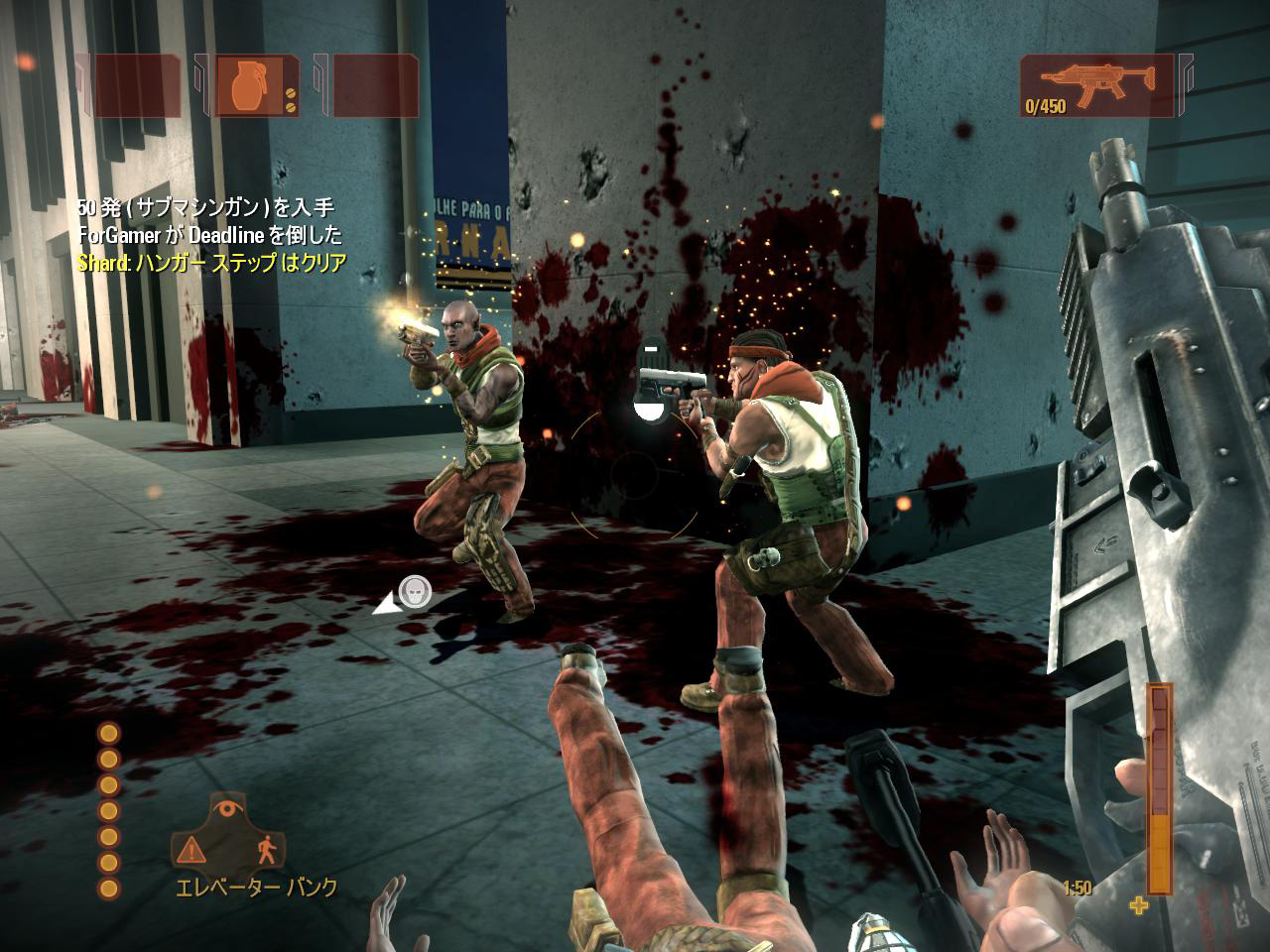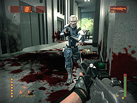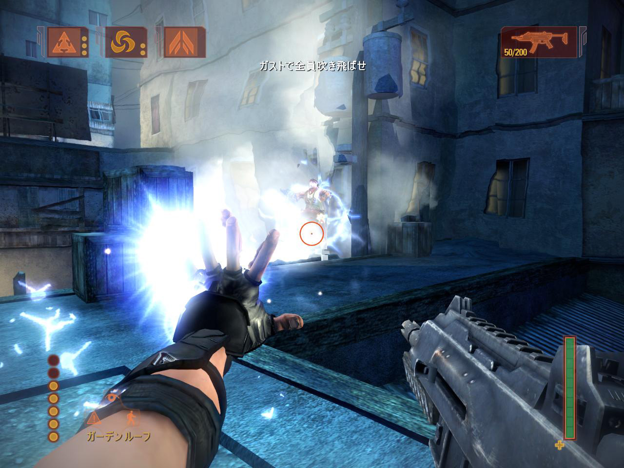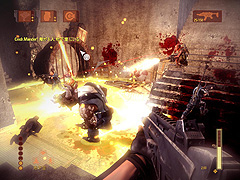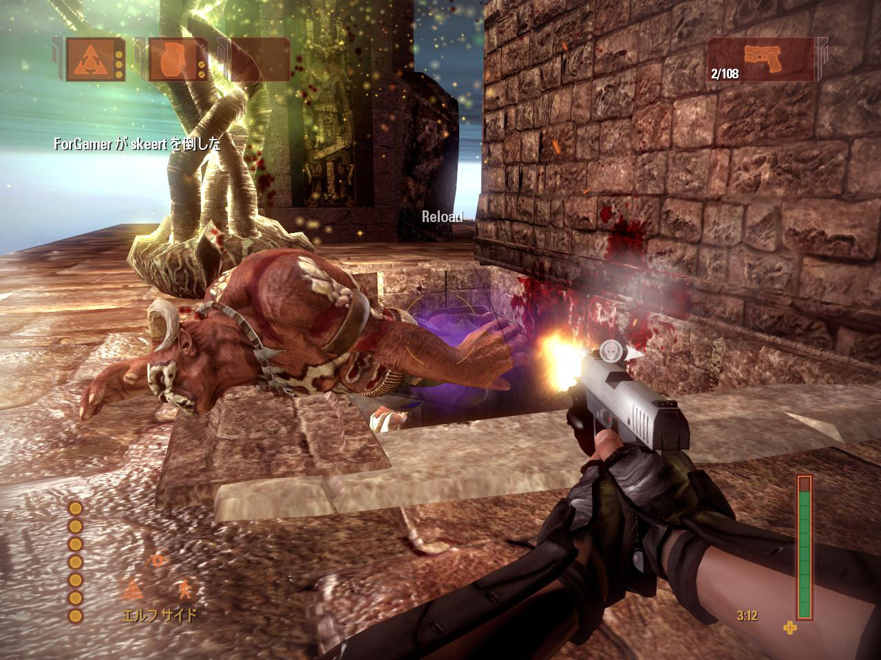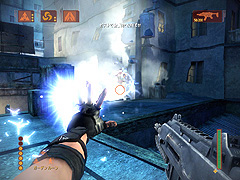 とはいえ,キモとなるFPS部分に関しても意外なほど(と言っては失礼だが)良くできている。銃器は連射すると銃口の跳ね上がりがきつくなるリアル系の設定。したがって,刻んで撃つ射撃法が有効となり,距離も重要だ。登場する兵器はどれも架空のものだが,有効射程,威力などはモデルとなった実物に準じており,現実のアナロジーが通用する。出血は驚くほど多く,刀で切り付けると鮮血が吹き出し,壁一面にも血が飛び散る。魔法の復活した世界は,意外なほど血なまぐさいのだ。