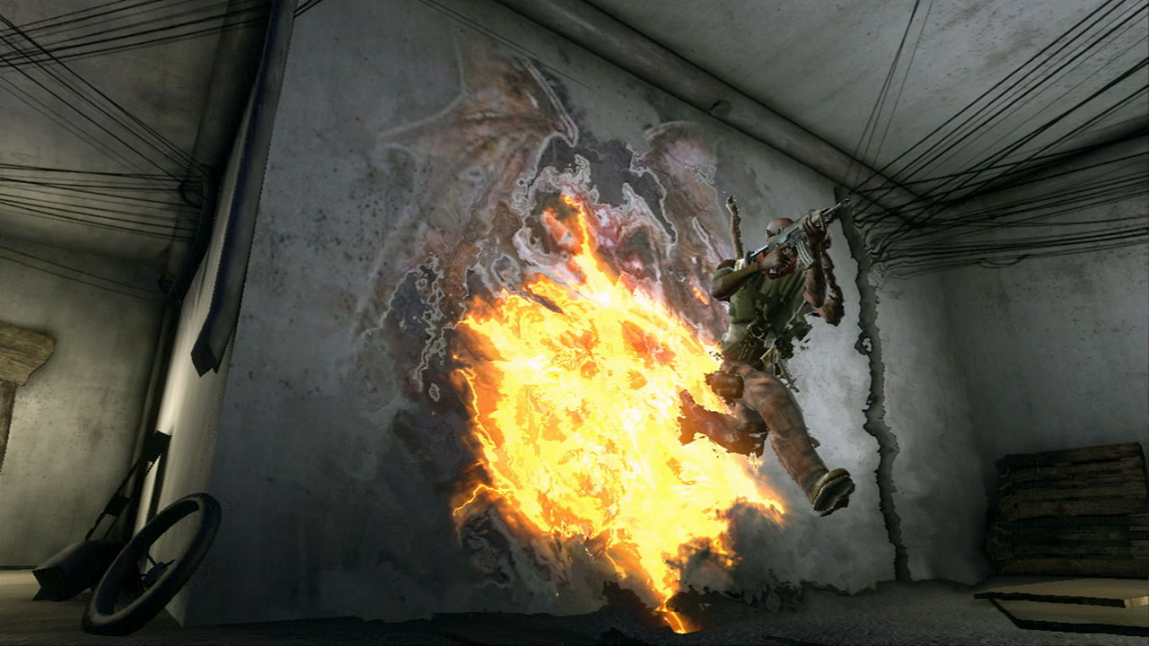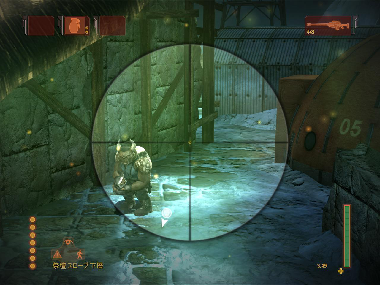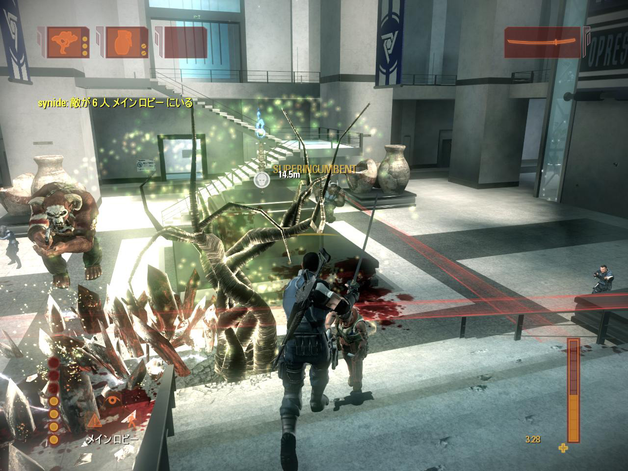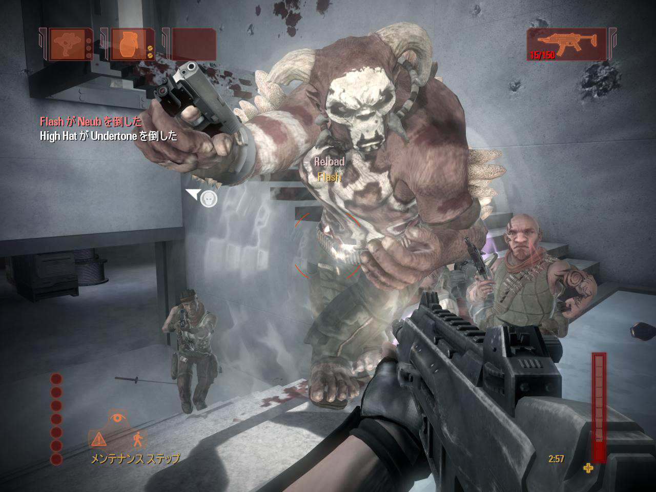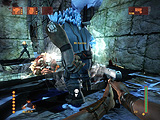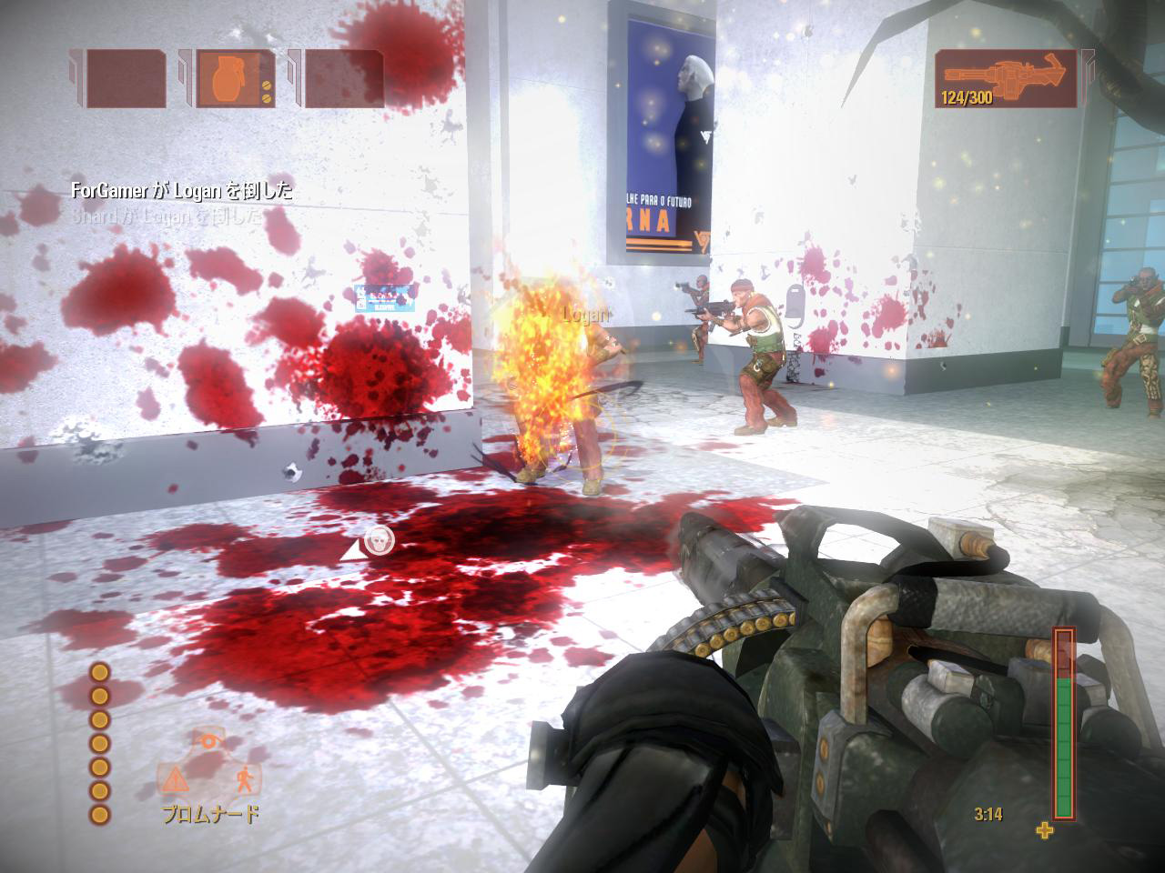とはいえ,キモとなるFPS部分に関しても意外なほど(と言っては失礼だが)良くできている。銃器は連射すると銃口の跳ね上がりがきつくなるリアル系の設定。したがって,刻んで撃つ射撃法が有効となり,距離も重要だ。登場する兵器はどれも架空のものだが,有効射程,威力などはモデルとなった実物に準じており,現実のアナロジーが通用する。出血は驚くほど多く,刀で切り付けると鮮血が吹き出し,壁一面にも血が飛び散る。魔法の復活した世界は,意外なほど血なまぐさいのだ。