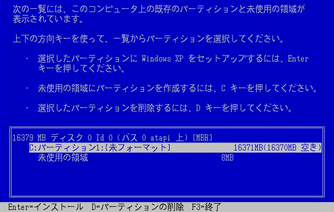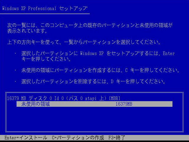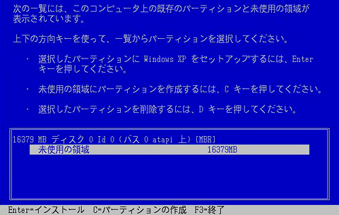 HDDのパーティション選択画面が出る。Cドライブのみ作成する場合は[Enter]キーを,パーティションを作成(HDDを複数ドライブに分割)する場合は[C]キーを押す
