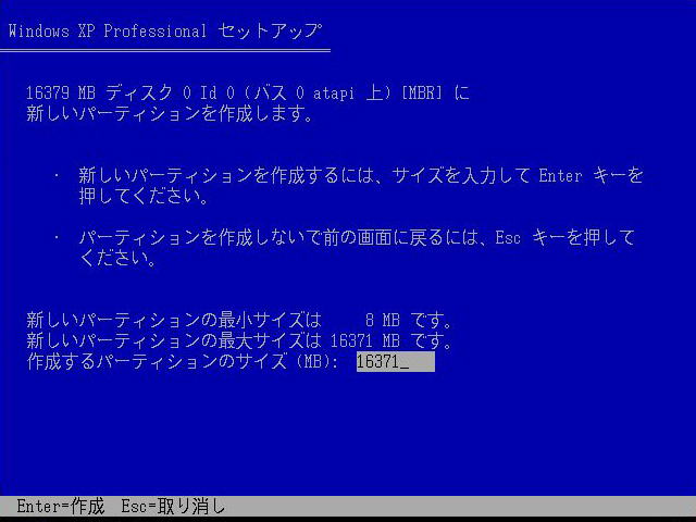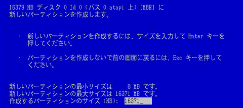 パーティションを作成することを選んだ場合はこの画面となる。[Backspace]キーで入力済みの数字を消去し,作成したいパーティションの容量を数字キーで入力する