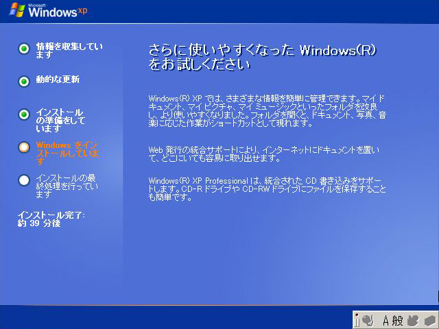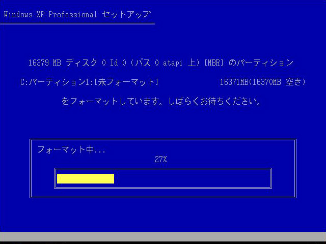 | 作成したパーティションの容量にもよるが,HDDのフォーマットには時間がかかる。その後,インストールが進行すると,PCは自動的に再起動する |