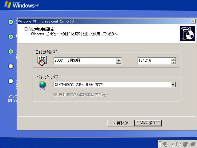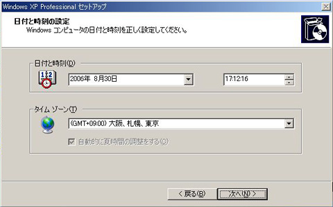 日時と時刻の設定を行う。あとで変更できるので,タイムゾーンが合っていることを確認したら,時刻合わせを省略して次に進んでもかまわない