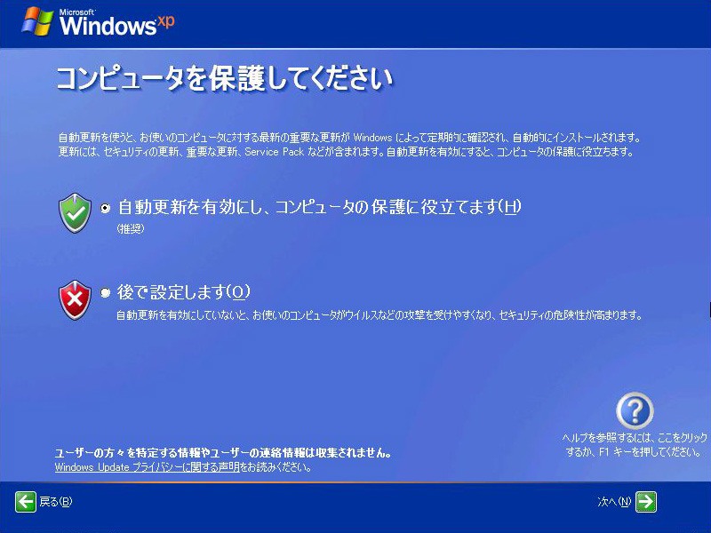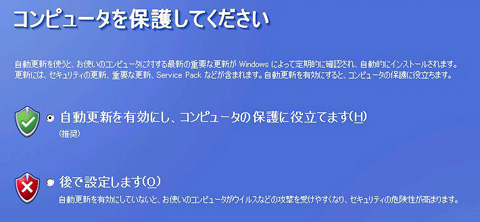 Windowsの自動更新機能を有効にするかどうか聞かれる。とくに思うところがなければ,自動更新を有効にしておいたほうがいい